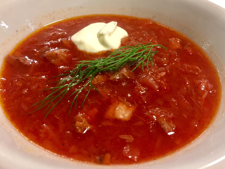 Così sono comparsi piatti come la Borsch, complessa e gustosa zuppa invernale alla barbabietola (molto amata dallo Zar Alessandro e dalla Zarina Caterina la Grande, piatto che giulia racconta nella versione ucraina, la più antica) su base di un bollito di manzo molto lavorato e con lentezza, oltre ad altri ingredienti come un tocco di estratto di pomodoro, cavolo cappuccio, patate, carote, strutto o olio evo, succo di limone, alloro, aneto, sale, pepe. Anche la panna acida, ma da servire separatamente, elemento che viene aggiunto a gusto di chi assapora questo piatto.