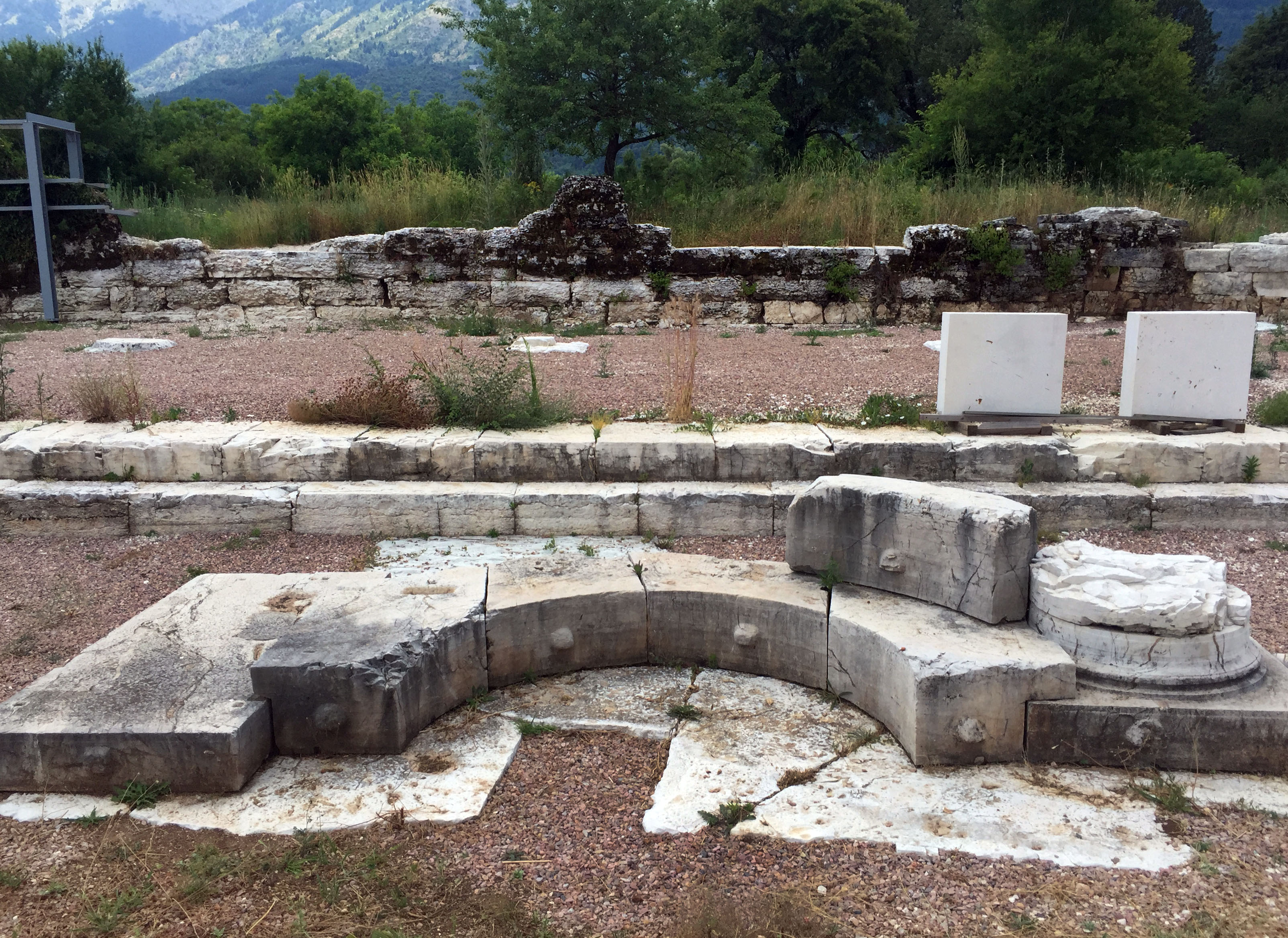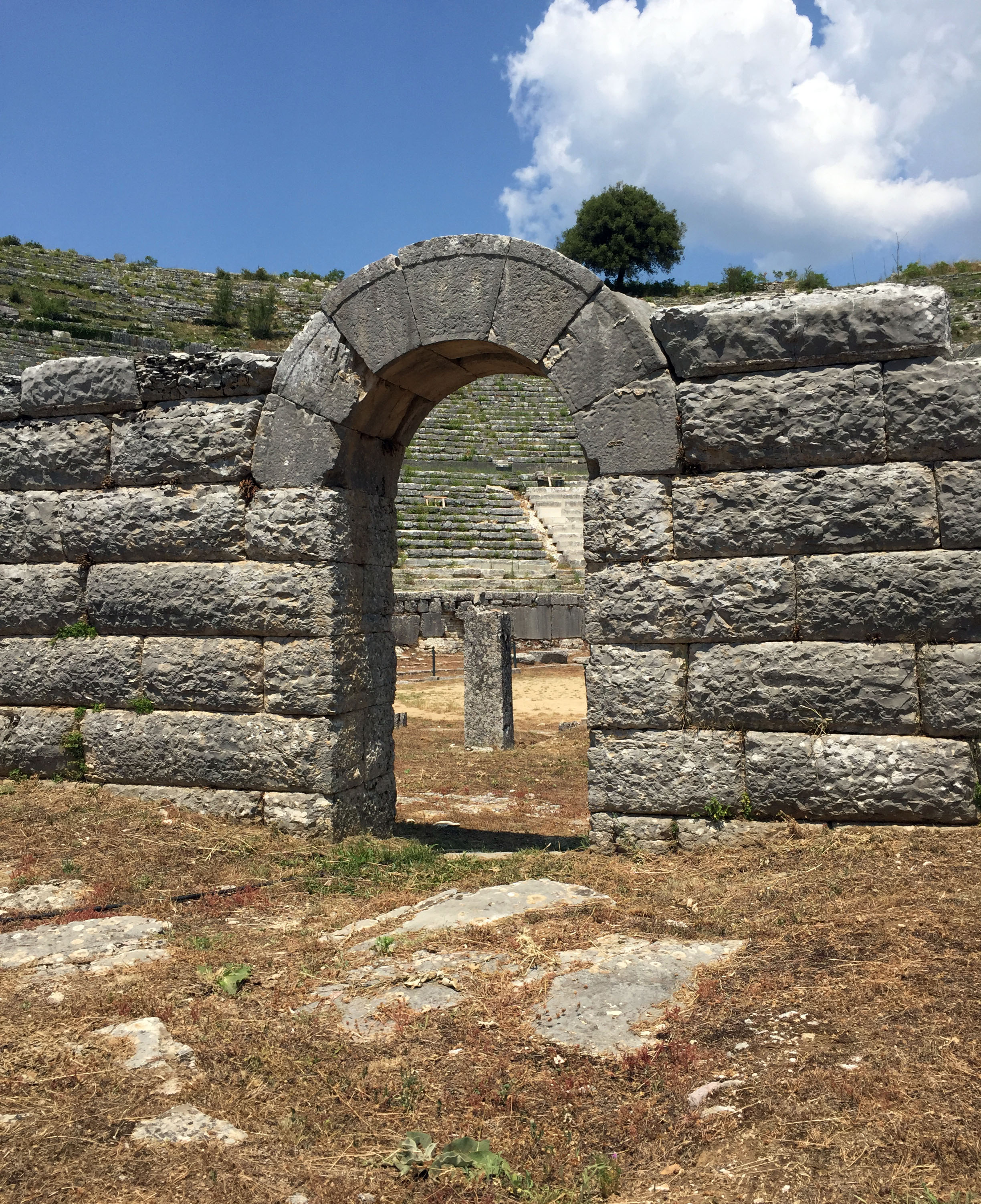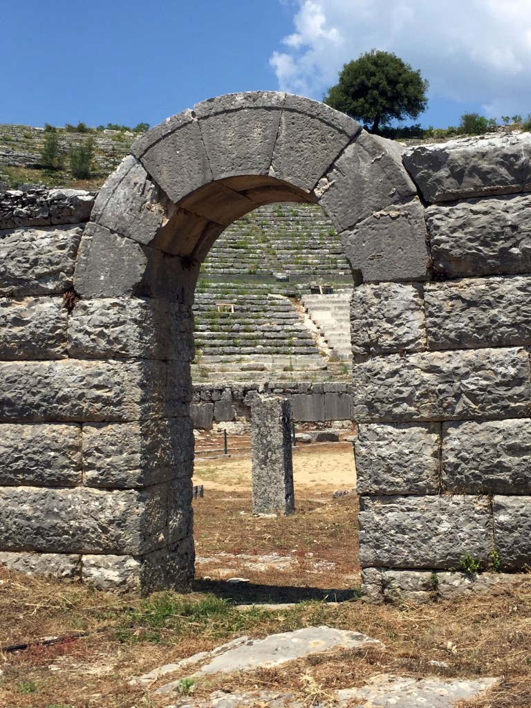Mel complesso e delizioso panorama spiccano i resti dell’antico teatro in quello che era uno dei centri più sacri della Grecia classica e dell’antichità.