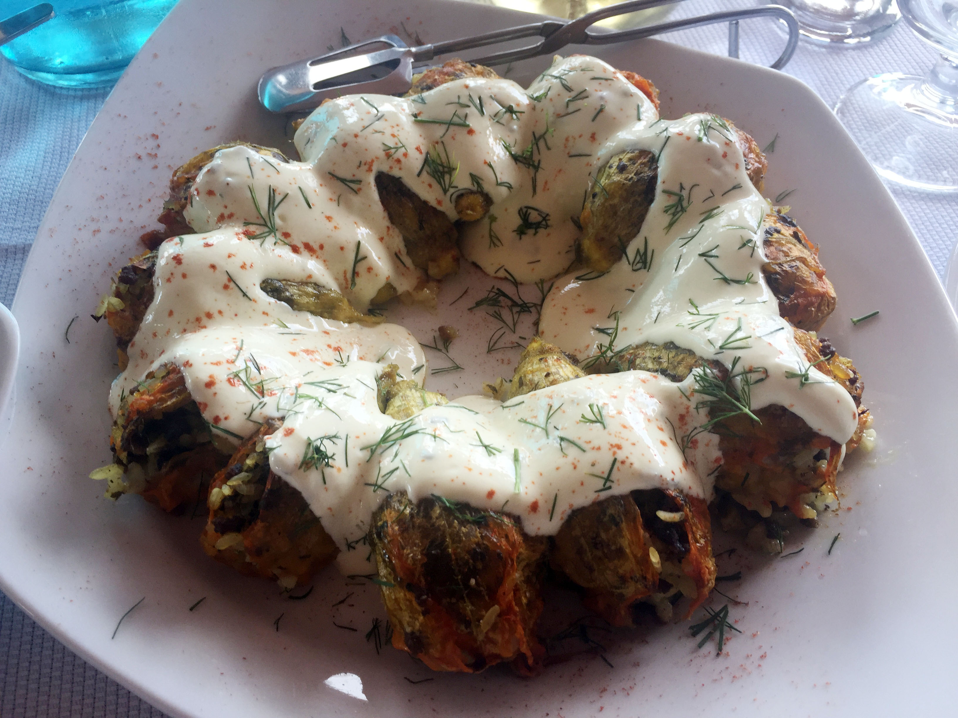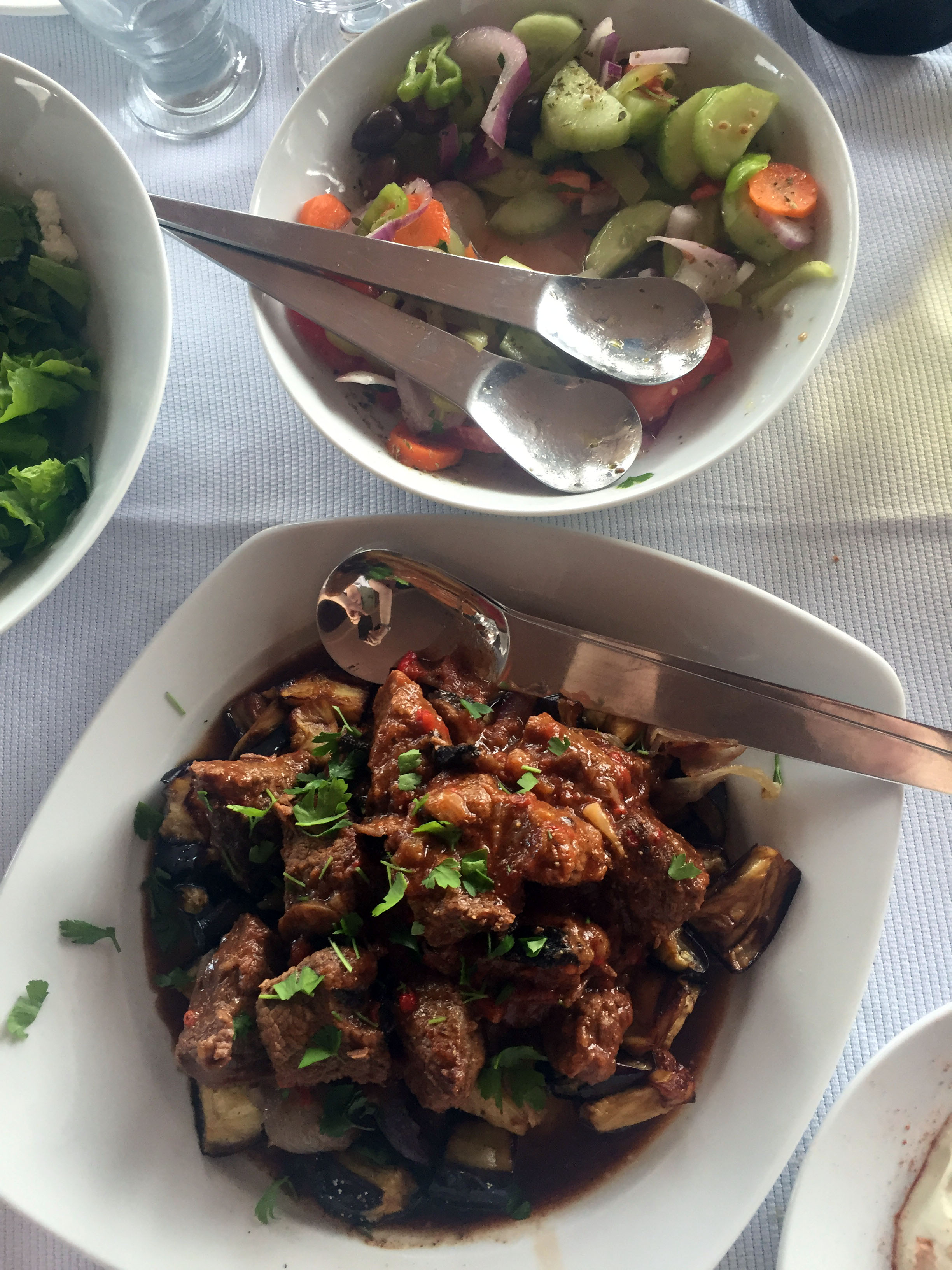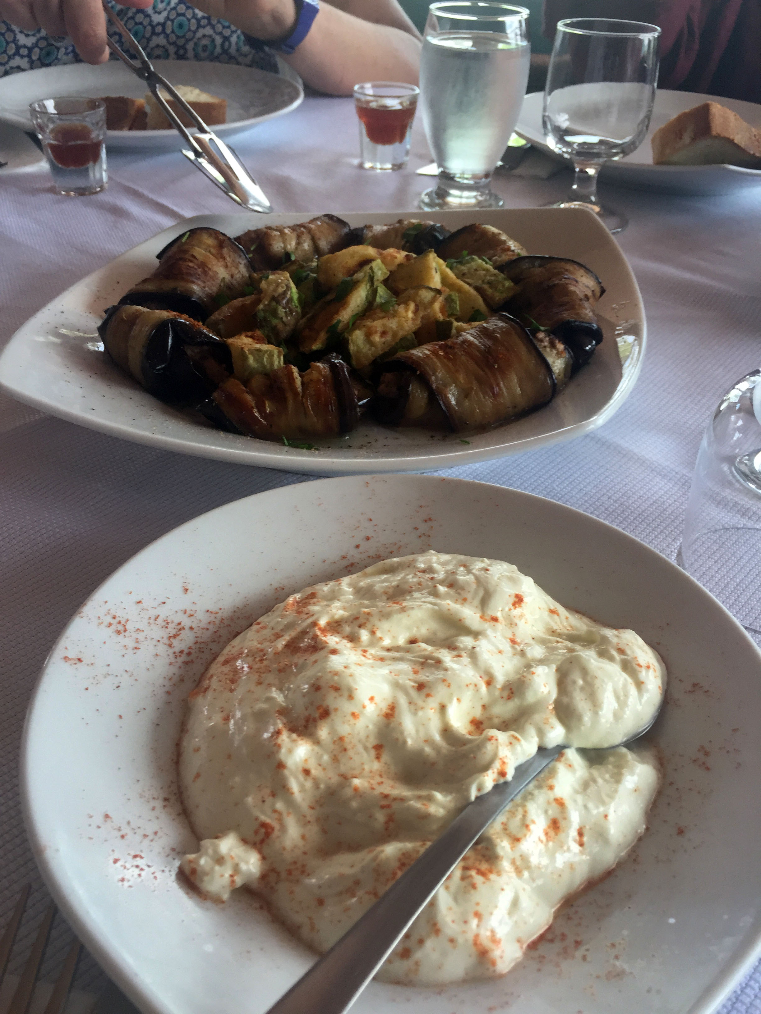 E ancora, una reinterpretazione epirota della caponata siciliana, il che si traduce in una nota meno spiccata dell’agrodolce. A seguire, bocconi di manzo in una salsa dolce e prezzemolo, involtini di melanzane con menta, lo yogurt speziato servito in terrine o inserito in pietanze e insalate.