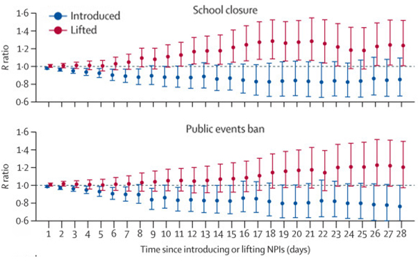 La riduzione dell’infezione nel tempo ha mostrato variazioni dal 3% al 24% il giorno 28 dopo l’introduzione delle limitazioni rispetto al giorno precedente l’inizio delle chiusure di scuole, servizi, eventi ecc. sebbene la riduzione fosse significativa solo per il divieto di eventi pubblici ( rapporto R 0,76, IC 95% 0,88-1 · 00).