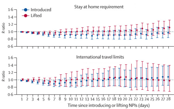 Per tutti gli altri NPI-chiusure, il limite superiore dell’IC al 95% era superiore a 1. Una tendenza all’aumento nel tempo dei contagi è stato riscontrato in seguito all’allentamento della chiusura scolastica, dei divieti di eventi pubblici, riunioni pubbliche di più di dieci persone, requisiti per rimanere a casa e limiti di movimento interni (R variava dall’11% al 25% il giorno 28 dopo la fine delle chiusure dei servizi rispetto all’ultimo giorno di lockdown: un aumento significativo dei nuovi contagi solo per la riapertura della scuola e la revoca dei divieti di raduni pubblici di più di dieci persone.