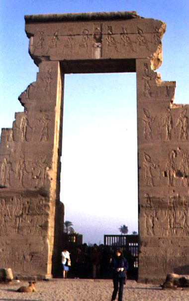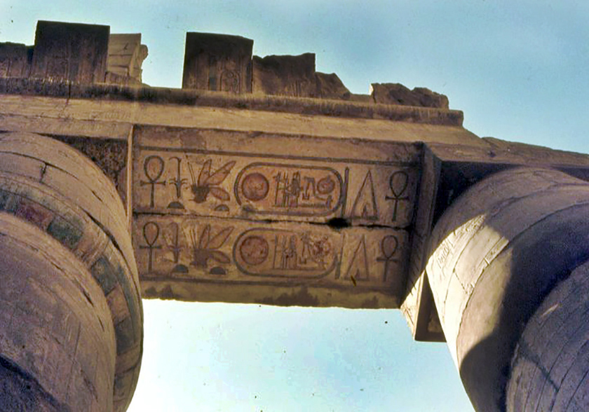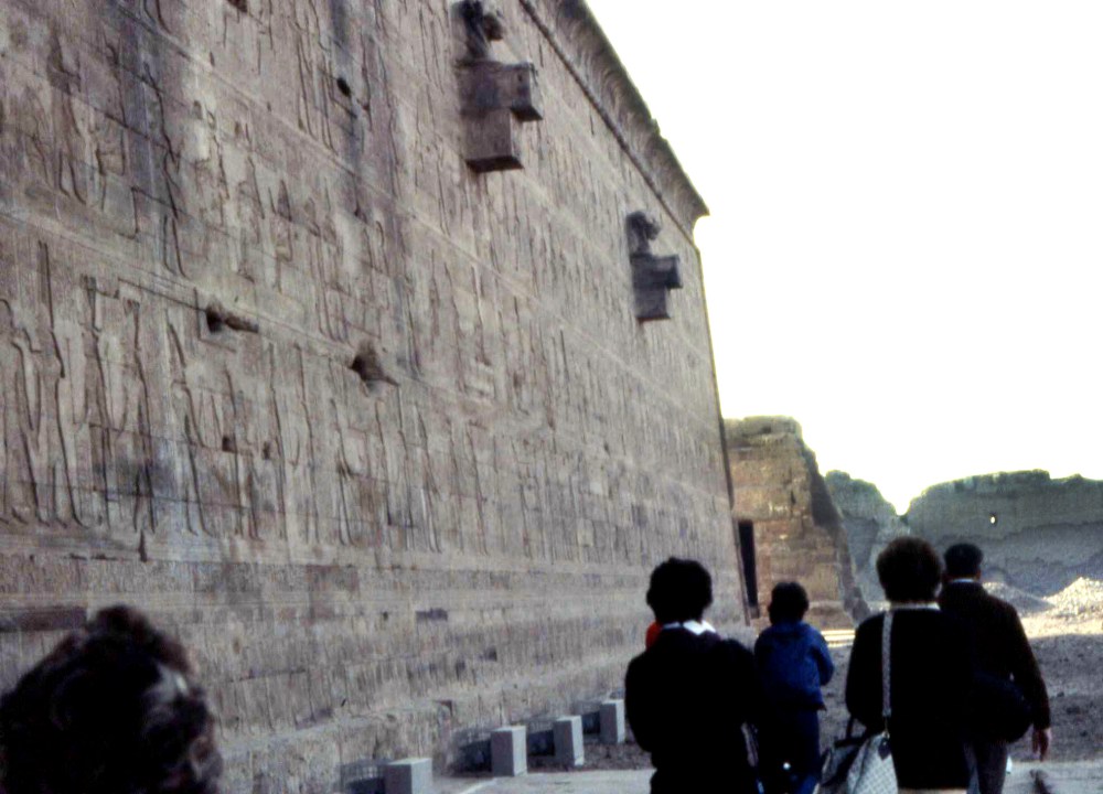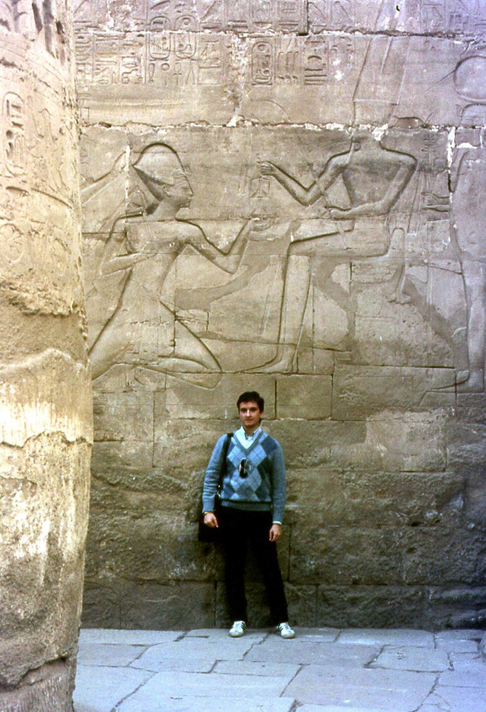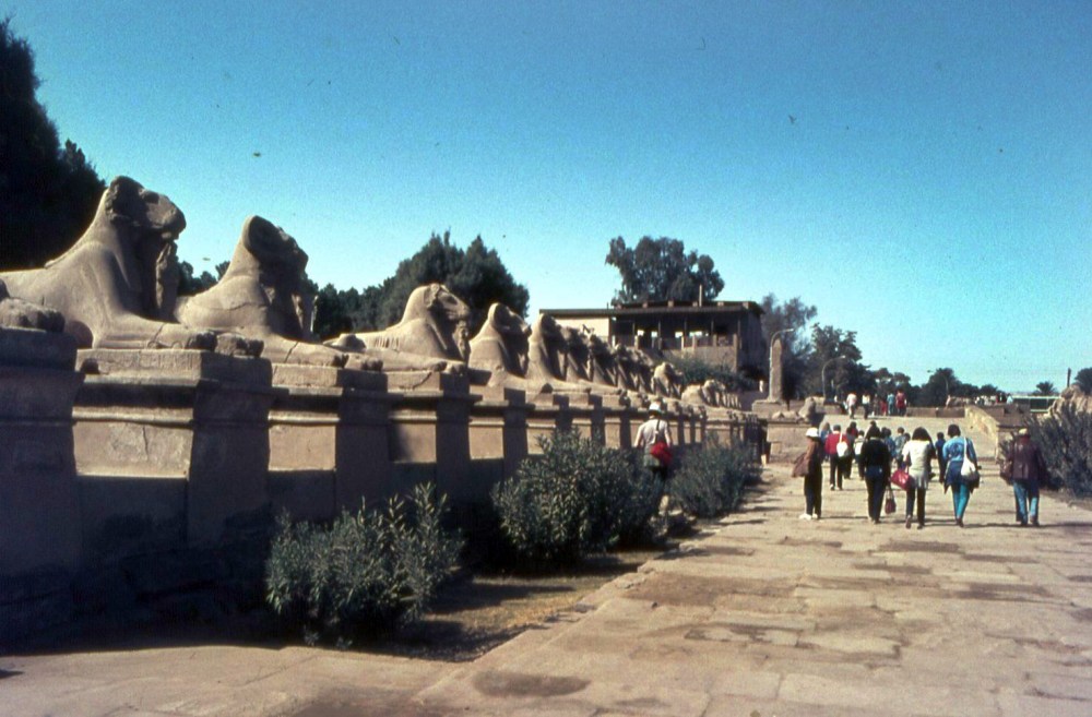 Un tempio divenuto sempre più ampio nei secoli, man mano che il susseguirsi di faraoni vedeva l’aggiungersi di sale, piloni di ingresso, colonnati, l’ampliamento del lago sacro, prolungamenti della struttura e molto altro (qui in basso immagini da un mio viaggio del 1983).