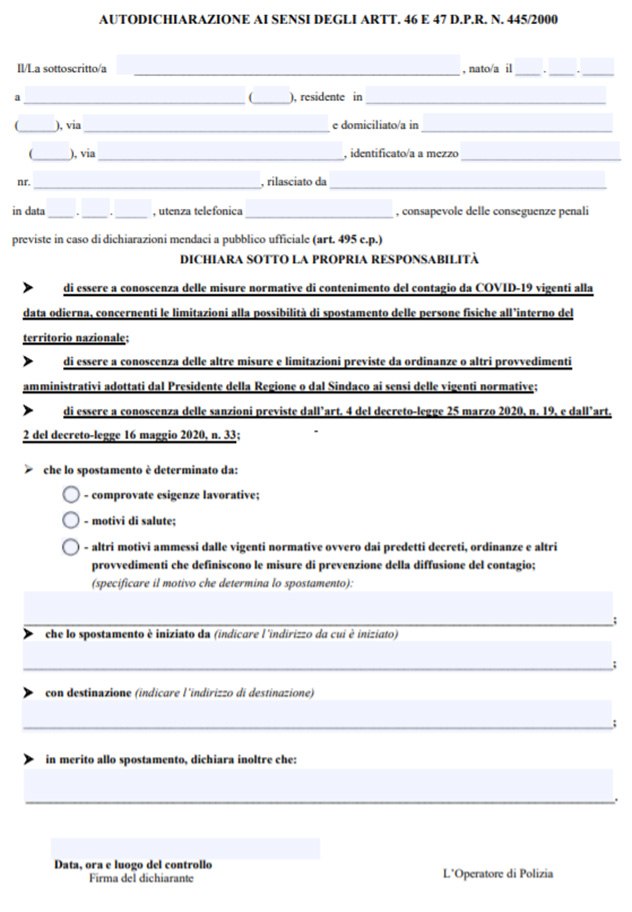 Da non dimenticare l’autodichiarazione – autocertificazione scelta da Governo e Viminale (anche se è il modello ideato a ottobre) per poter circolare soprattutto in “periodo rosso”, solo nei casi e nei modi previsti, più sotto specificati: link al documento pdf editabile anche direttamente da pc.