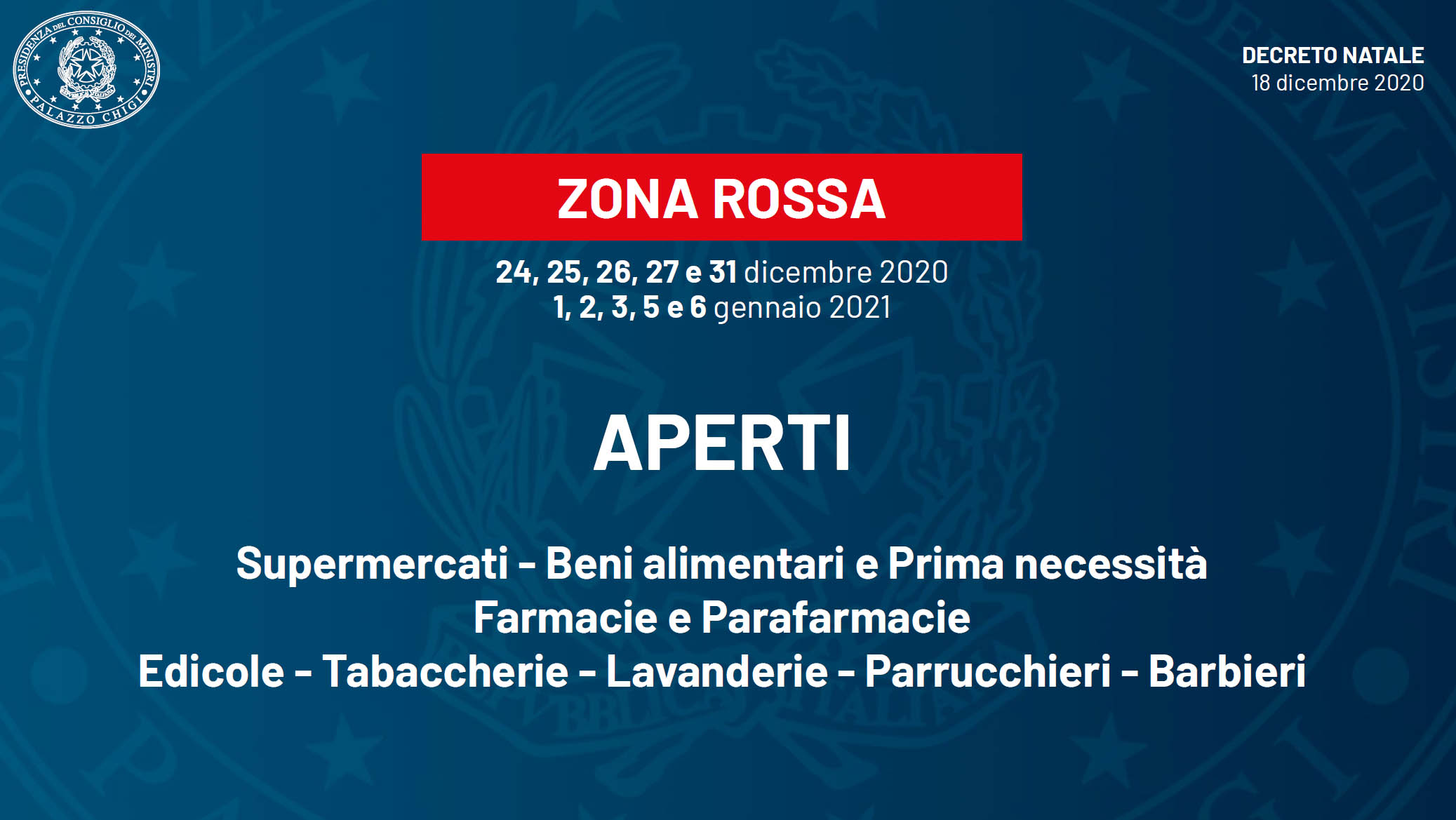 Saranno aperte farmacie, parafarmacie, supermercati, attività che vendono prodotti di prima necessità, edicole, lavanderie, parrucchieri e barbieri.