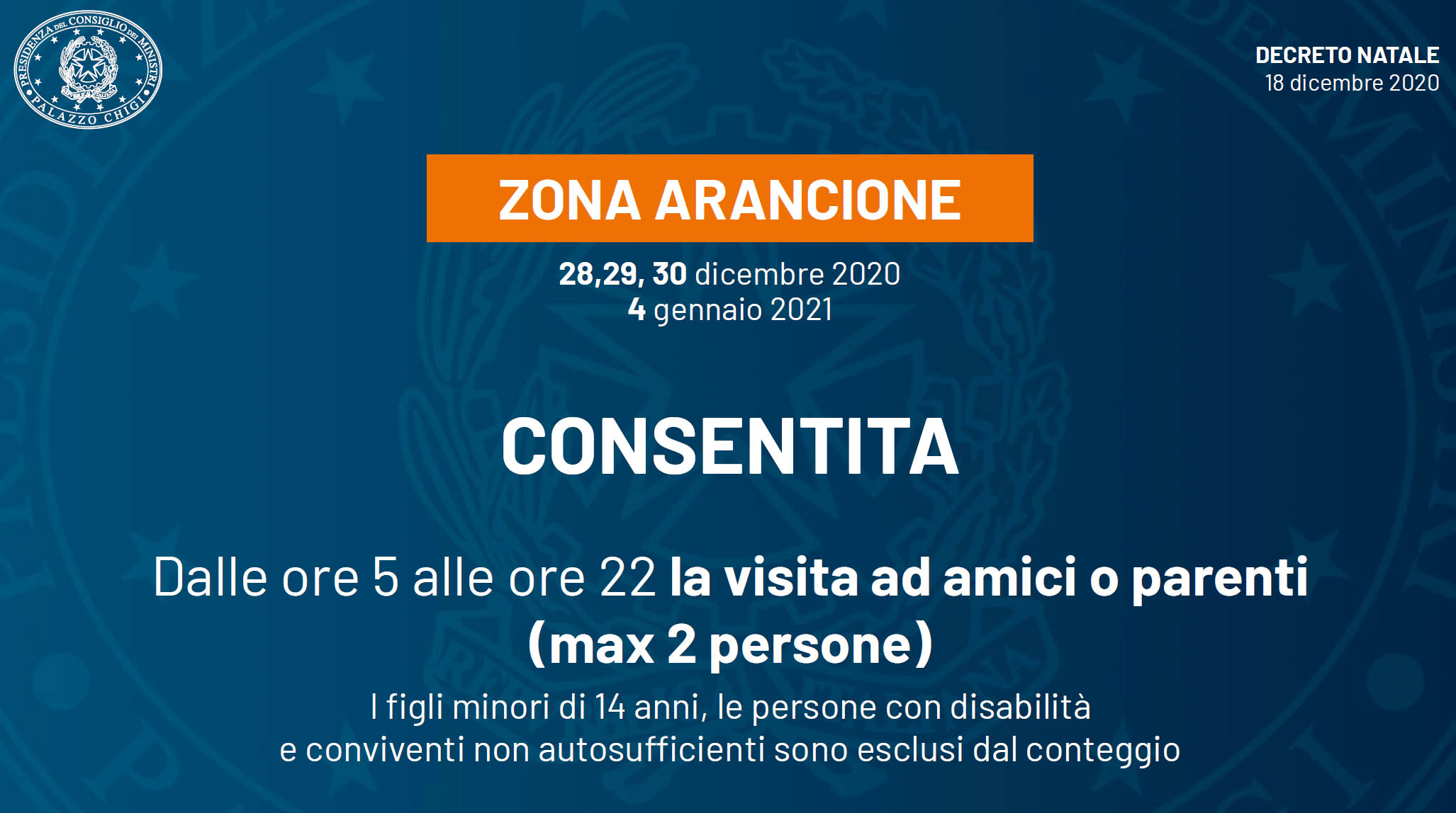Dal Decreto: “Durante i giorni compresi tra il 24 dicembre 2020 e il 6 gennaio 2021 è altresì consentito lo spostamento verso una sola abitazione privata, ubicata nella medesima regione, una sola volta al giorno, in un arco temporale compreso fra le ore 05,00 e le ore 22,00, e nei limiti di due persone, ulteriori rispetto a quelle ivi già conviventi, oltre ai minori di anni 14 sui quali tali persone esercitino la potestà genitoriale e alle persone disabili o non autosufficienti conviventi“.