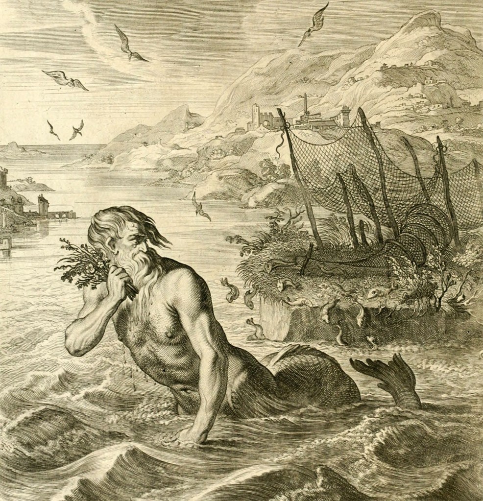 Una magia prende forma e si dischiude. Qualcosa cambia in lui. Un nuovo vigore, la schiena si raddrizza come se non sentisse più il peso degli anni, i muscoli si rimpolpano. Poi dai piedi la sua pelle inizia a colorarsi di verde, fino ai peli, la barba e i capelli. Riluce tutto quanto e ha riflessi come quando un pesce che guizza dall’acqua viene colpito dai raggi del sole. Il mare diventa attraente e lui si tuffa. Glauco vola nell’acqua, sfiora le profondità marine, nuota insieme ai pesci.