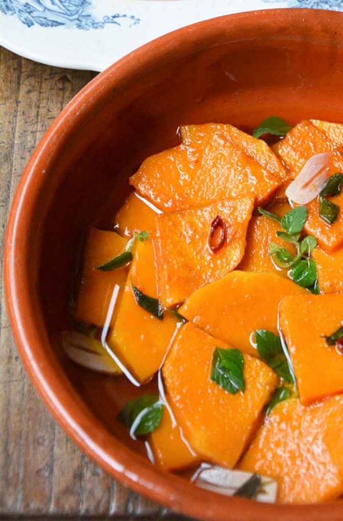 Dopo la frittura, le fette vanno prelevate e messe in altro tegame dove continueranno la cottura insieme ad almeno un bicchiere abbondante di aceto e un’evanescenza di aglio (pochissimo): la sensazione agrodolce si deve sentire bene, grazie alla dolcezza della zucca che si sposa con l’aceto stesso. Se è il caso, oltre al sale (se prima di ogni cosa le fette non sono state tenute a bagno col sale) va aggiunto anche un pochino di zucchero… bisogna assaggiare prima di decidere e, di conseguenza, agire anche in base al proprio gusto. Non dimenticate le olive se non le avete fatte friggere prima insieme alla zucca! Questa seconda fase ha una breve durata. L’aceto in buona parte evaporerà mentre zucca e olive ne prenderanno il sapore. Alla fine, spegnendo il fuoco, per chi gradisce non guasta l’aggiunta di qualche foglia di menta.