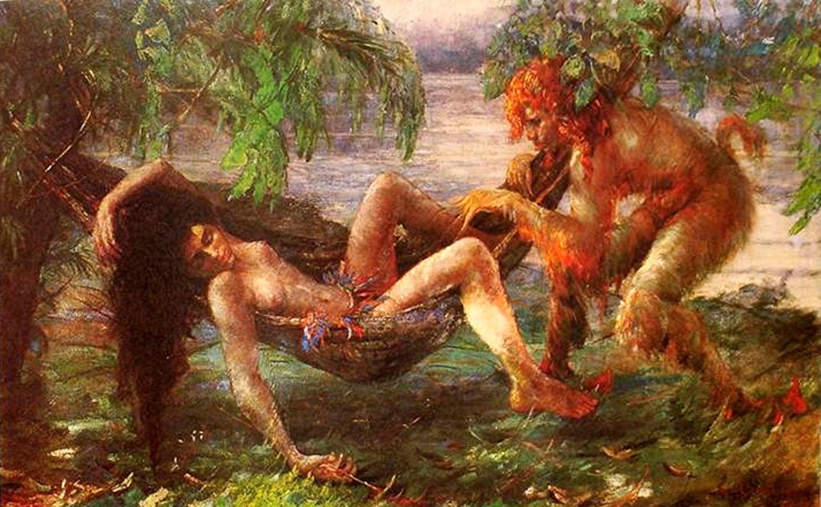 Per tenerlo calmo e tentare di avere salva la vita, le popolazioni che dovevano attraversare aree boschive gli lasciavano offerte, soprattutto tabacco e cachaça, un’acquavite dell’area brasiliana ottenuta dalla distillazione del succo di canna da zucchero, prodotti che l’essere mitologico gradiva fortemente (qui in basso, “Curupira guardando una ragazza che dorme, O Curupira – Lenda Amazônica – Brasile, di Manoel Santiago, 1926).