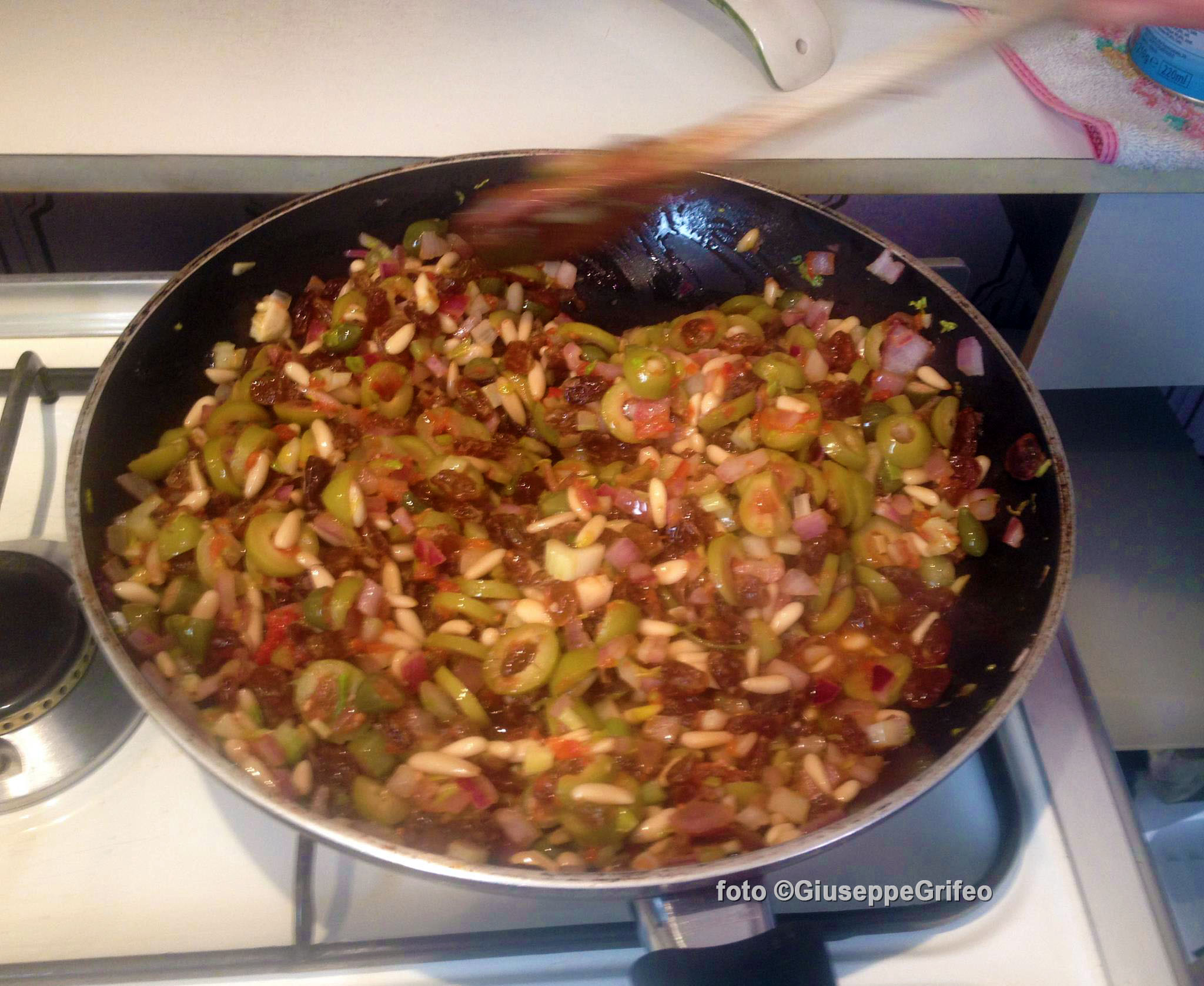 - la prima delle immagini riguarda il soffritto di olive verdi tagliate, uva passa, pinoli, un po’ di pomodoro a pezzetti, capperi sottaceto a pezzi o frutti di cappero, cipolla e sedano a pezzetti;