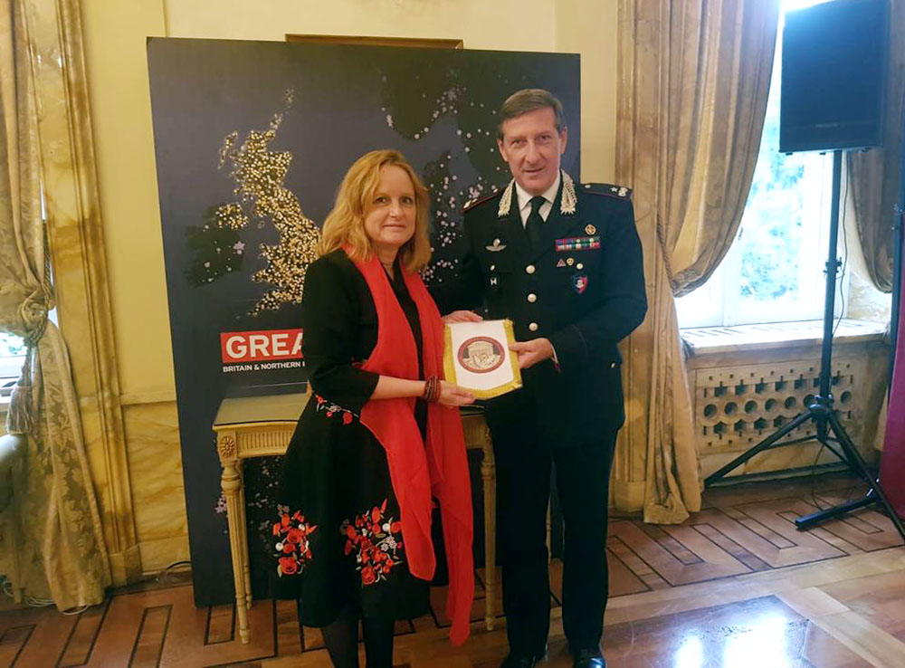 Lynda Albertson, amministratore delegato di Arca, col generale di brigata, Fabrizio Parrulli, precedente comandante dei Carabinieri-TPC, anno 2018, Ambasciata britannica a Roma