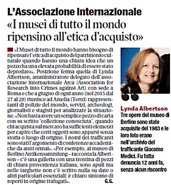 Quasi dieci anni di lavoro, dall’estate 2011 a oggi, passati alla ricerca di reperti trafugati, di opere d’arte rubate, tesa ad aiutare le Forze dell’Ordine nel rintracciare le rotte organizzate da ricettatori e da mercanti d’arte senza scrupoli per vendere o esportare illegalmente beni preziosi piazzandoli nei mercati internazionali. Lynda Albertson è protagonista da tutti questi anni di questa lotta, al vertice di ARCA, Association for Research Into Crimes Against Art (link) che ha sede italiana ad Amelia (Terni).