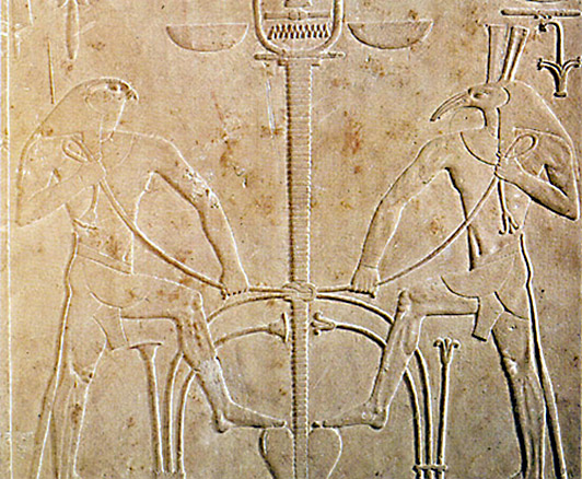 “Horo, in uno scatto d’ira, tagliò la testa alla madre. Thot guarì subito Iside ponendole, al posto della sua, una testa di mucca. La battaglia riprese e durò all’infinito senza vincitori né vinti. S’intromise allora autoritariamente Thot, che guarì Seth, ma gli impose di restituire l’occhio a Horo. La luna tornò a risplendere. Intervennero allora anche gli altri dei e posero la questione al giudizio di Thot”.