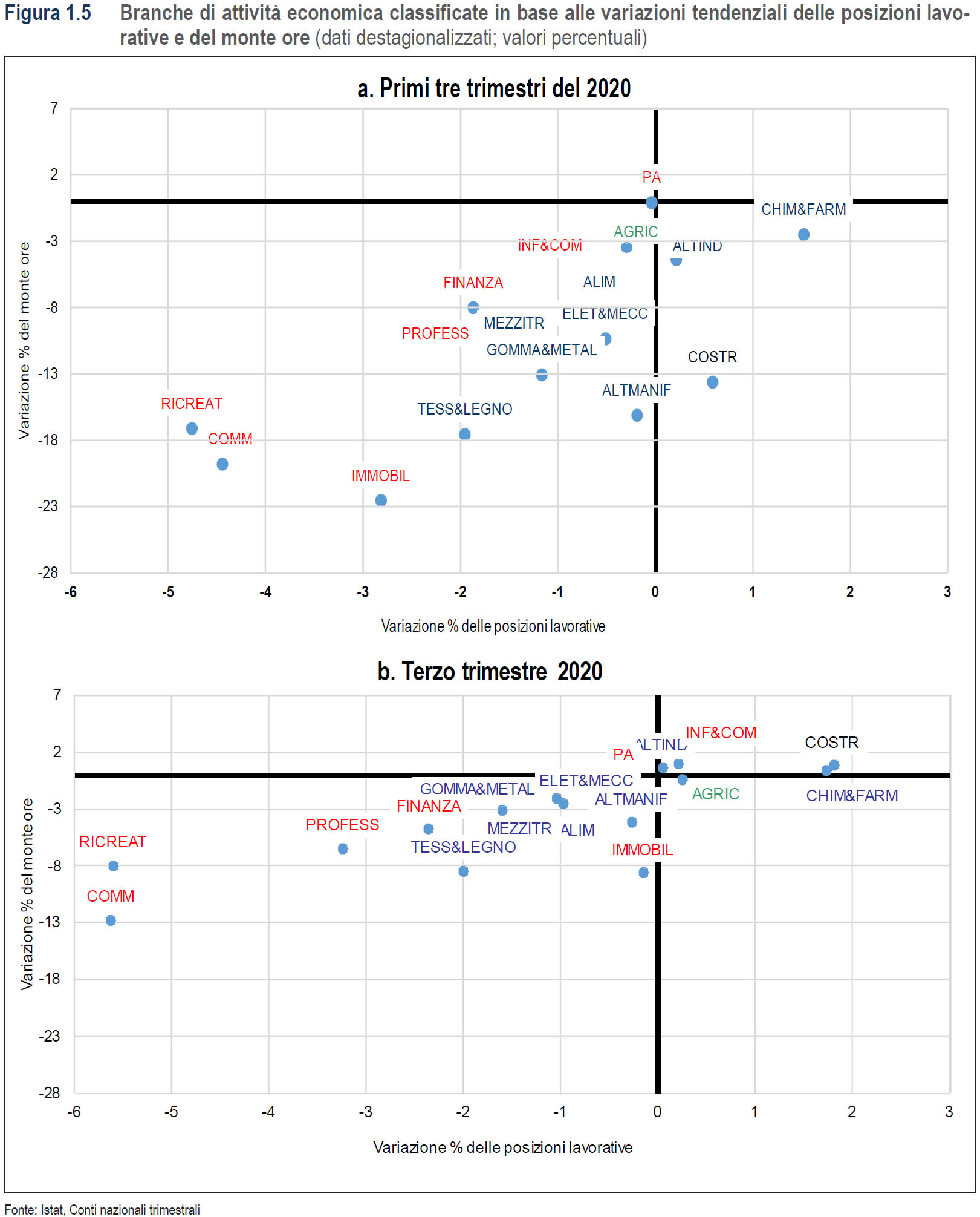 “Nel nostro Paese, e in buona parte dei paesi europei, gli effetti della crisi sulla dinamica delle ore lavorate sono stati determinati principalmente dalla riduzione delle ore effettivamente lavorate pro capite e dagli occupati assenti dal lavoro. Questi si sono combinati con specifici effetti settoriali e di filiera (conseguenza diretta e indiretta delle misure di contenimento) e con le caratteristiche del tessuto economico italiano: elevato peso ed eterogeneità dei lavoratori indipendenti, prevalenza di imprese di piccole dimensioni e a conduzione familiare, concentrazione in settori dei servizi che hanno risentito di più delle restrizioni alla mobilità imposte dalla crisi del COVID-19, elevate ore lavorate pro capite, informalità, difficoltà di accesso al lavoro per giovani e donne, un ridotto tasso di occupazione, una intrinseca rigidità e fragilità“.