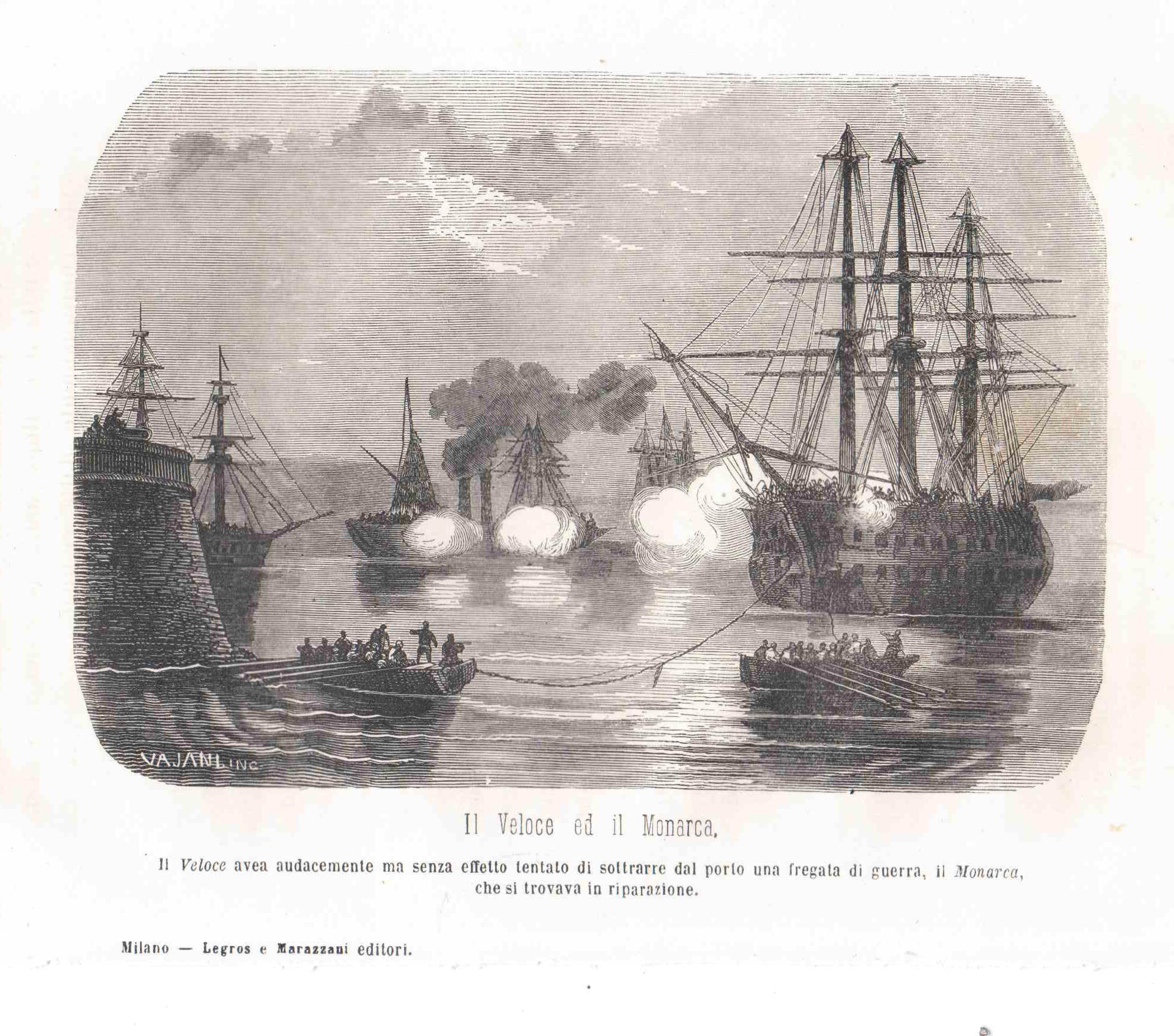 Ultima immagine in bianco e nero qui sopra: il vascello Monarca nel 1860 davanti a Castel dell’Ovo – cliccare sulle immagini per ingrandirle