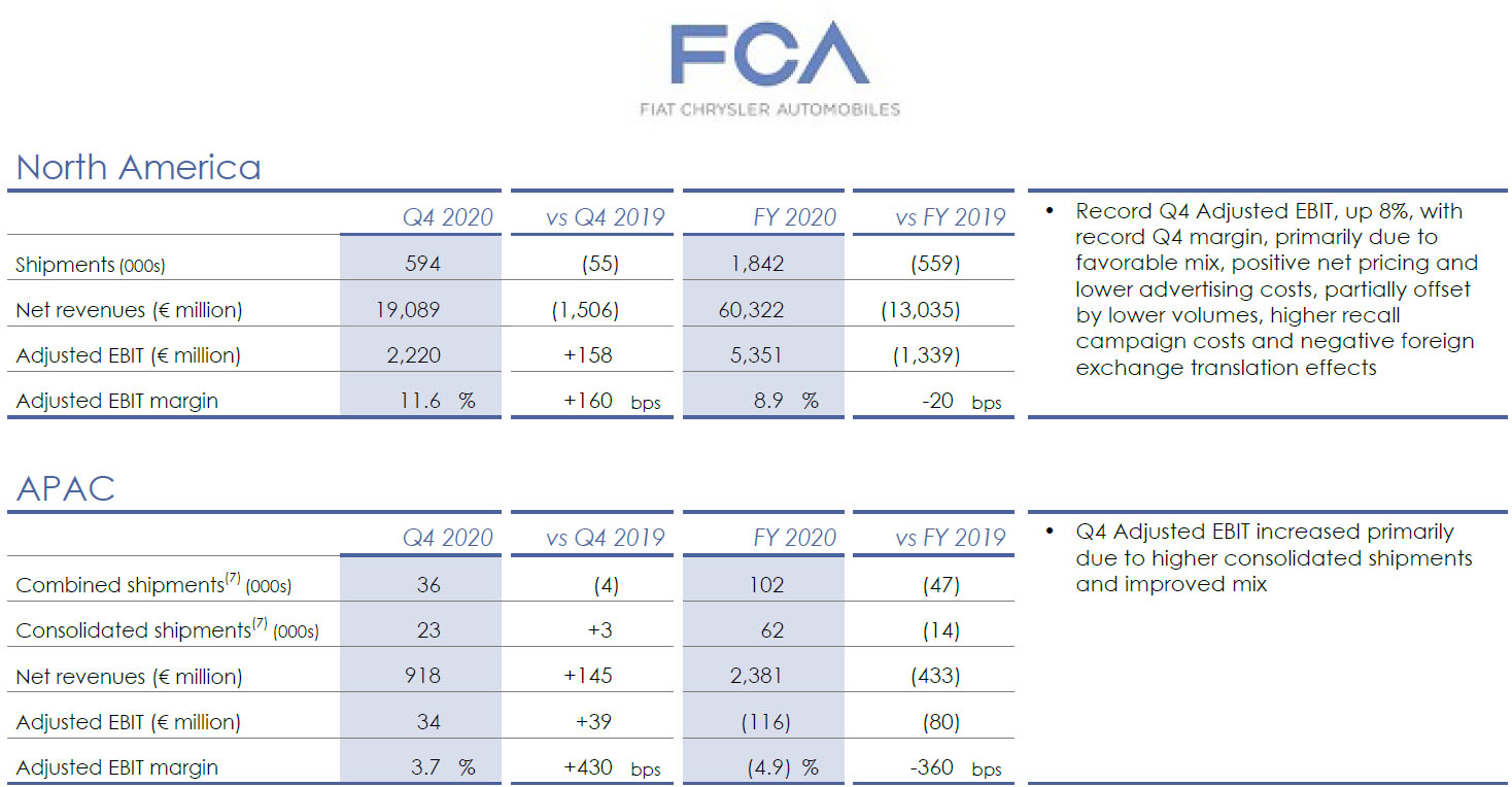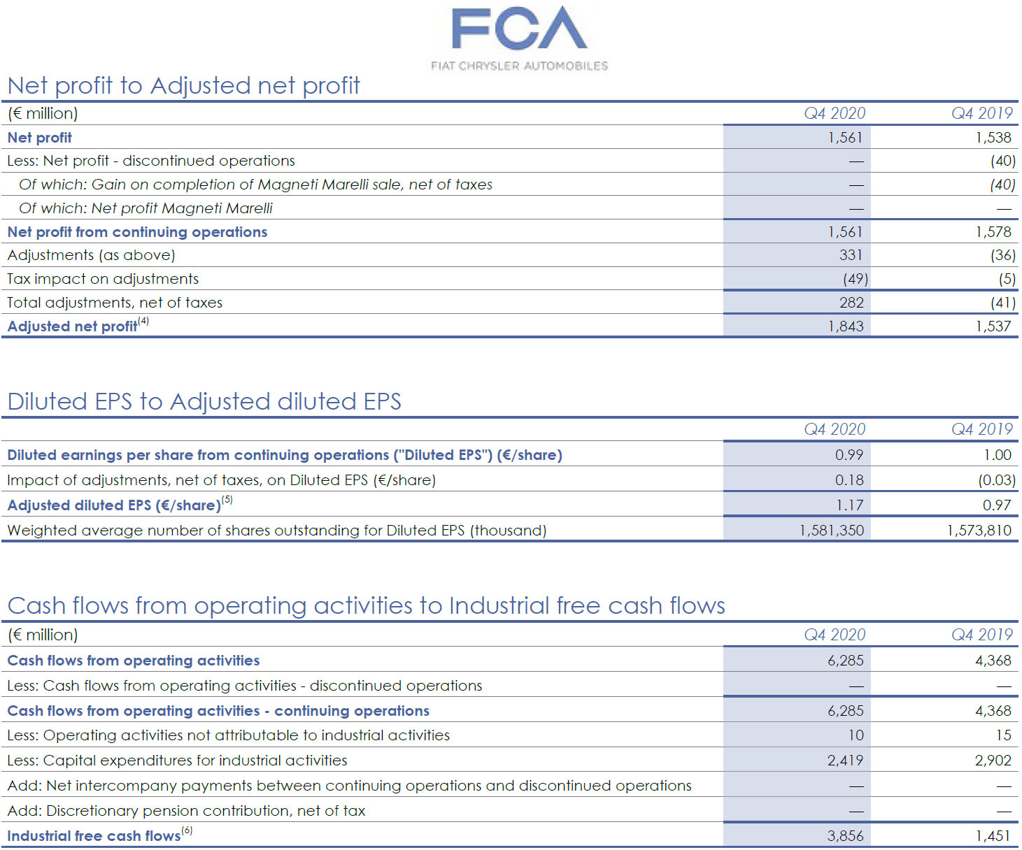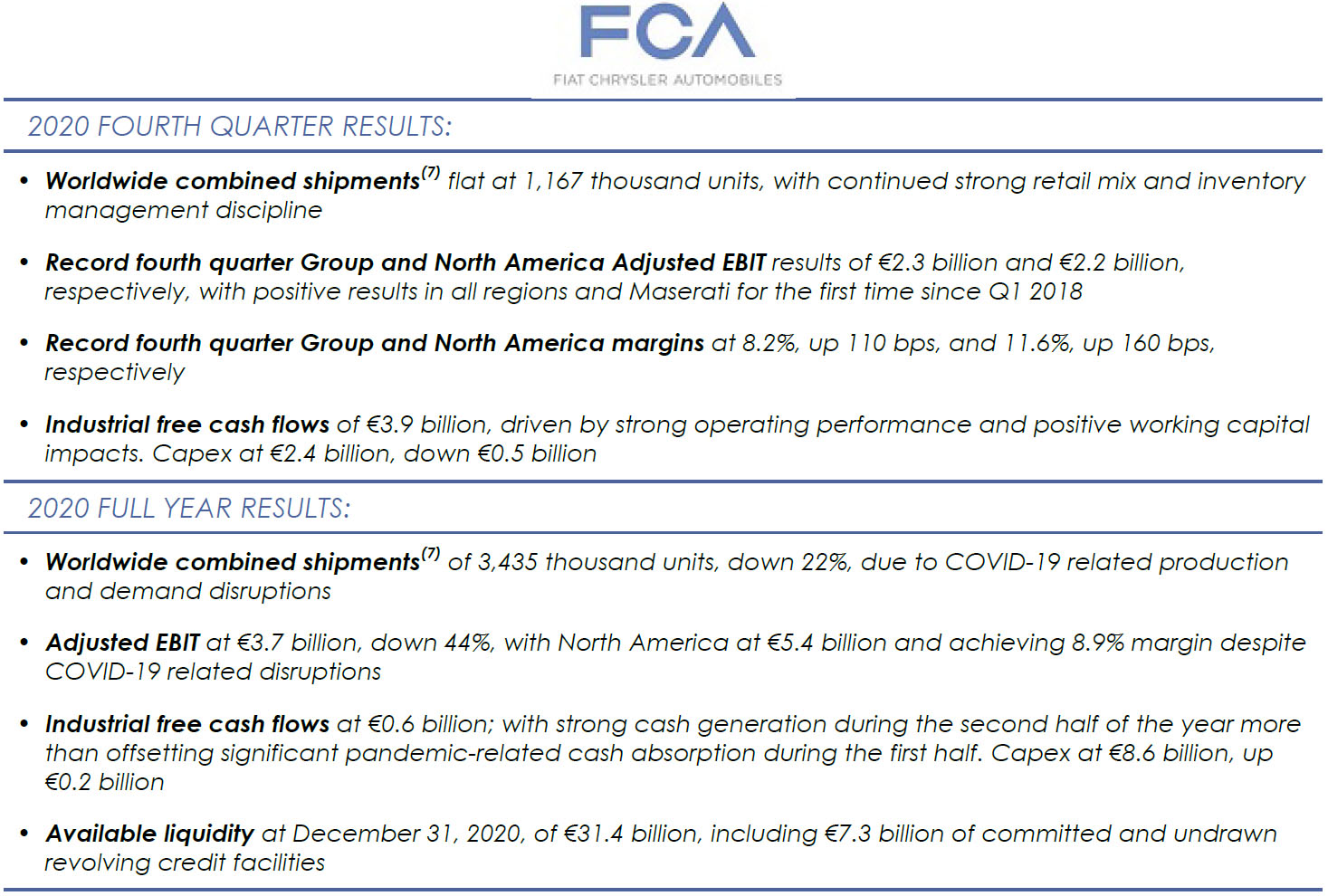 Il 16 gennaio 2021, Fiat Chrysler Automobiles N.V. (FCA) e Peugeot S.A. (PSA) si sono unite in Stellantis (link) e, in relazione ai risultati d’esercizio 2020, Carlos Tavares, amministratore delegato del nuovo Gruppo, ha sottolineato che “questi risultati dimostrano la solidità finanziaria di Stellantis, che nasce dall’unione di due Gruppi sani e forti. Stellantis debutta posizionandosi in alto ed è pienamente concentrata sul raggiungimento delle sinergie preannunciate”.