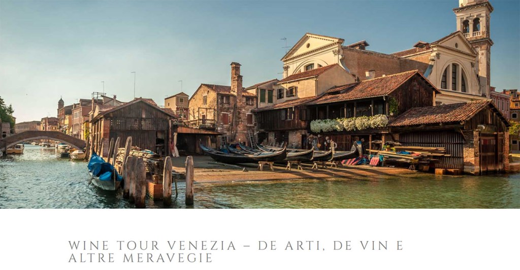“Wine Tour Venezia – De arti, de Vin e altre meravegie” (link) ideato per gli amanti dell’arte, un percorso nel distretto “artistico” per eccellenza, tra le “meravegie” (meraviglie) del passato e della modernità, trovando ristoro in storiche enoteche e osterie.