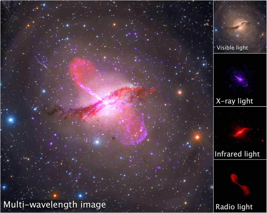 Se l’osservazione di Centaurus A viene fatta utilizzando la gamma dei raggi X e della luce radio, si apre una scena ancora più impressionante: dal nucleo della galassia ellittica deforme si osservano spettacolari getti di materiale esplosi dal suo buco nero supermassiccio attivo, noto come nucleo galattico attivo o AGN, quindi l’espulsione di materiale nello spazio ben oltre i limiti della stessa galassia.