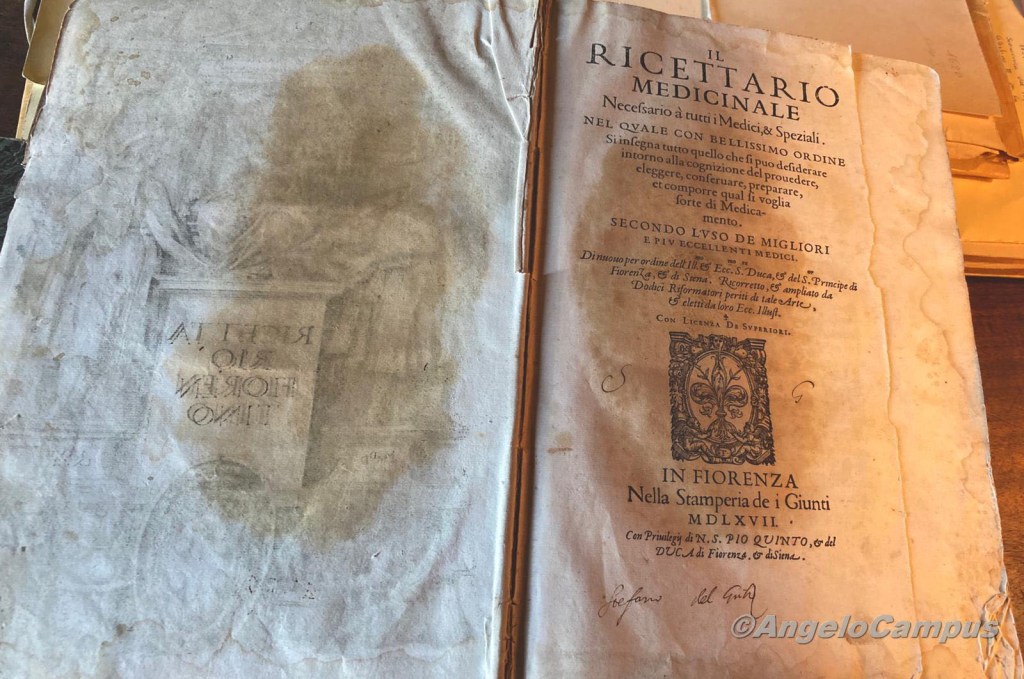 Per non parlare di volumi rari e unici come un antico Ricettario fiorentino del 1567 con una sezione medica dedicata alle piante note, il loro utilizzo e altri particolari con uno scopo ben descritto nel frontespizio della prima pagina: “Nel quale con bellissimo ordine si insegna tutto quello che si può desiderare intorno alla cognizione del provedere, eleggere, conservare, preparare et comporre qual si voglia sorte di Medicamento“.