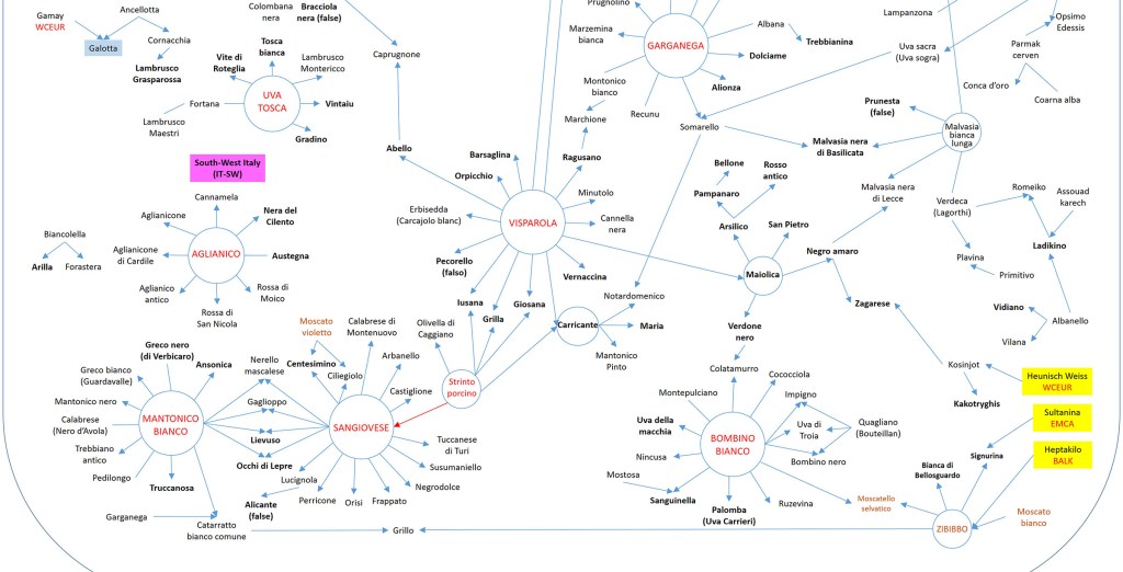 - “Strinto porcino” e la sua prole “Sangiovese“, “Mantonico bianco” e “Aglianico” sono le principali varietà fondatrici dei vitigni dell’Italia sudoccidentale (IT-SW);