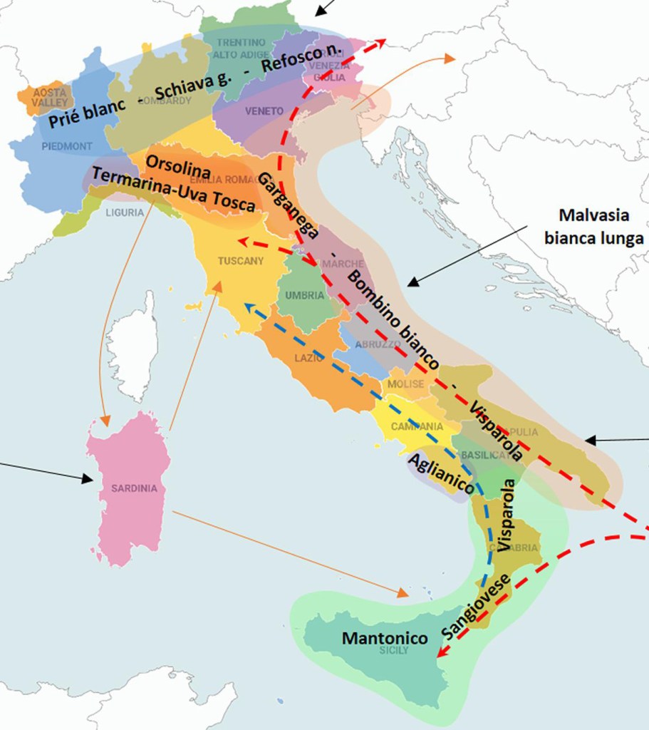 Come sottolineato nella ricerca, la rete di parentela risultante ha suggerito che il germoplasma della vite italiana tradizionale proviene in gran parte da alcune varietà centrali geograficamente distribuite in diverse aree di influenza genetica: