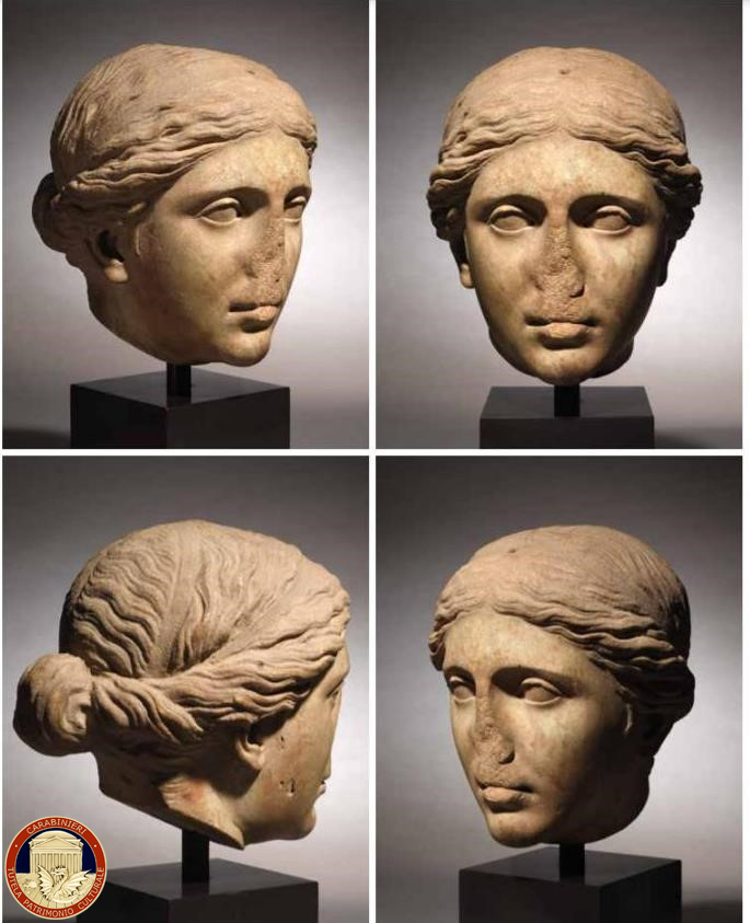 È la stessa copertina del dossier pubblicato dai Carabinieri TPC a essere dominata dalla splendida Testa di divinità femminile romana, risalente al I secolo d.C., individuata a seguito di indagini in campo internazionale. La testa, che fino al 12 dicembre del 1977 si trovava all’ingresso del Foro Romano, era stata staccata dal suo busto panneggiato e portata via da (ancora oggi) sconosciuti.