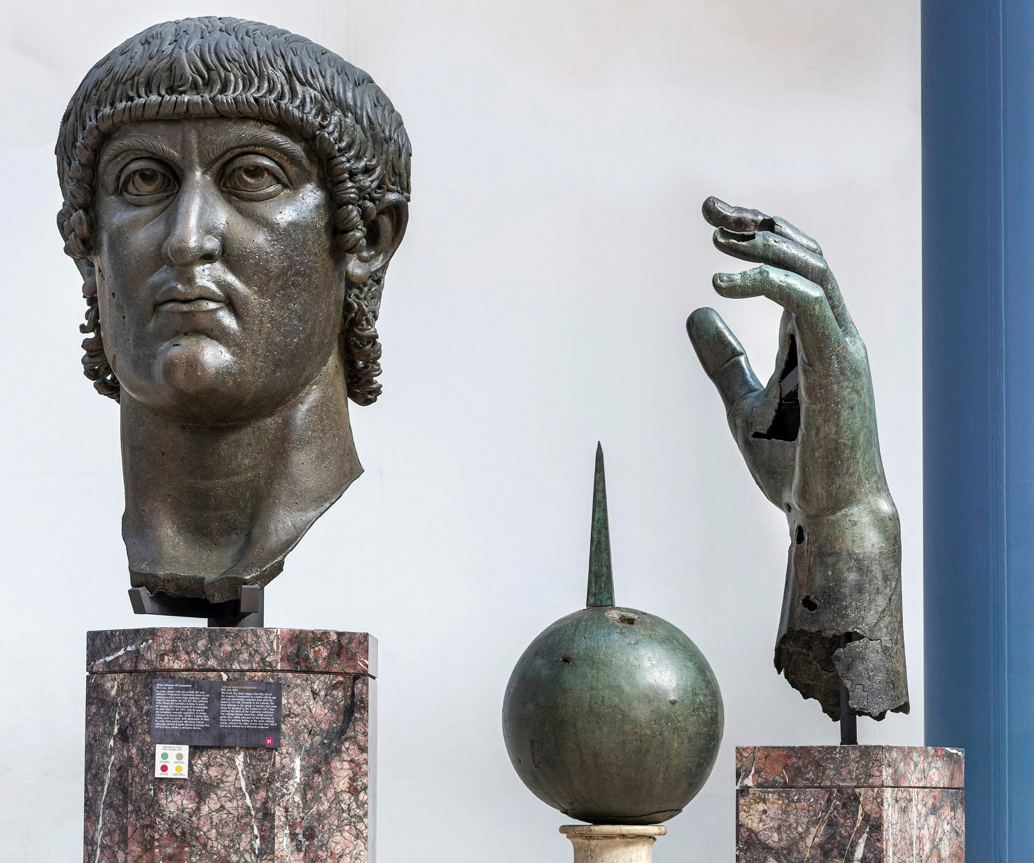 Il colosso in bronzo di Costantino è uno dei maggiori simboli storici e nei Musei Capitolini è conservata la testa, la mano sinistra, con alcuni frammenti mancanti in corrispondenza del dito indice, del medio, dell’anulare e del palmo. Tra i pezzi del colosso anche una grande sfera un tempo sorretta dalla mano.