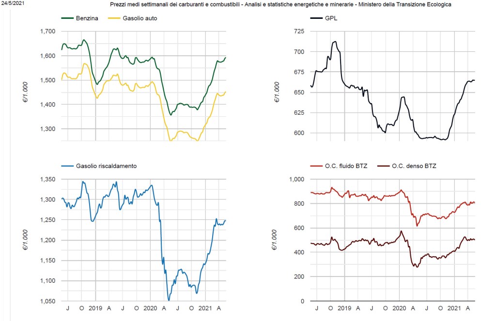 I carburanti salgono, salgono di prezzo… ma le accise? Un’impennata dei prezzi che, oltre alla solita motivazione della bella stagione (si va e si andrà in ferie, ci si sposterà, quindi carburanti più cari), ingloba anche l’altra speculazione: allentamento dell’isolamento, concessione più larghe nei movimenti della gente in questa fase calante della pandemia… quindi dobbiamo pagare di più per andare in giro in riacquistata libertà. Durante il periodo più crudo dell’infezione, i prezzi erano crollati (basta vedere i grafici qui in basso).