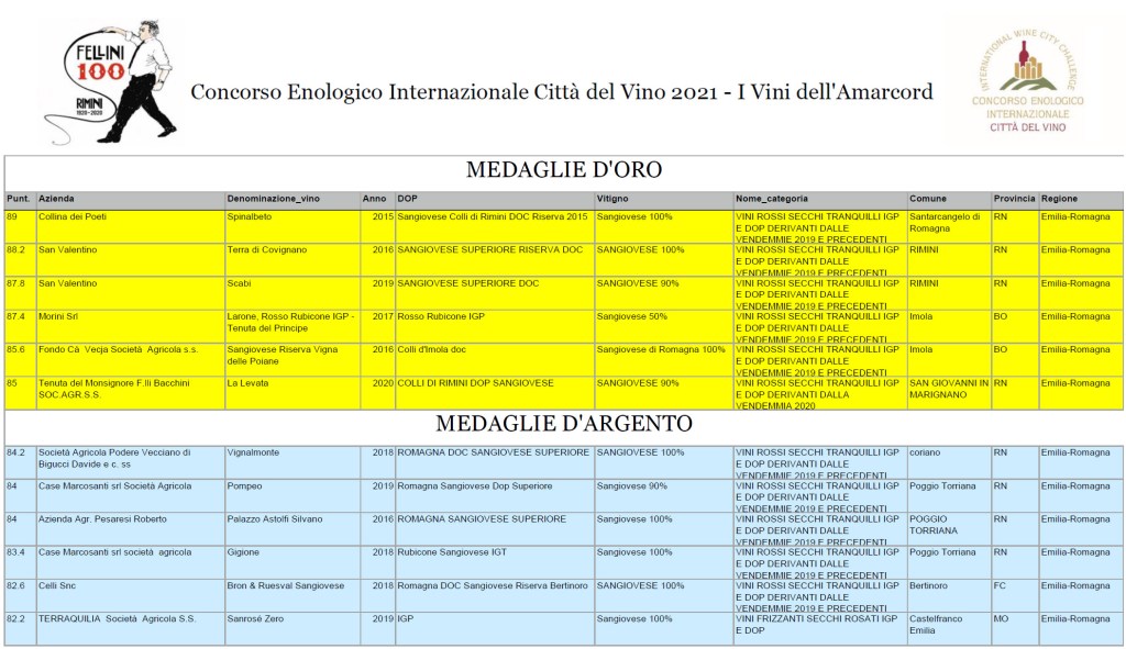Il primo vino assoluto con Medaglia d’Oro è il Sangiovese Colli di Rimini Doc Riserva 2015 “Spinalbeto” dell’Azienda Collina dei Poeti di Sant’Arcangelo di Romagna (link classifica completa Fellini/Amarcord in file pdf).