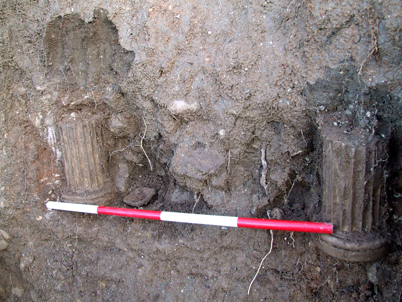 L’indagine portò al ritrovamento di altre nicchie della stessa tipologia di quelle già note – incasso quadrangolare con interno intonacato – fu rinvenuto, infatti, un architrave in pietra con dentelli, certamente il coronamento di un’edicola. In più, un’ulteriore edicola monumentale denominata E 123.