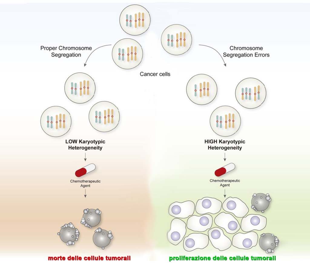 La ricerca sottolinea che “gli errori mitotici (ndR: più in basso NOTA 1) portano all’aneuploidia, una condizione di squilibrio del cariotipo (ndR: più in basso NOTA 2) frequentemente riscontrata nelle cellule tumorali. Le alterazioni del numero di copie cromosomiche inducono un’ampia varietà di stress cellulari, inclusa l’instabilità del genoma. Qui, mostriamo che le cellule tumorali potrebbero sfruttare l’instabilità del genoma indotta da aneuploidia e le conseguenti modifiche del numero di copie del gene, per sopravvivere in condizioni di pressione selettiva, come avviene con la chemioterapia. La resistenza ai farmaci chemioterapici è stata dettata dall’acquisizione di cariotipi ricorrenti, indicando che il dosaggio genico potrebbe svolgere un ruolo nel determinare la chemioresistenza. Pertanto, il nostro studio stabilisce un nesso causale tra i cambiamenti guidati dall’aneuploidia nel numero di copie geniche e la chemioresistenza e potrebbe spiegare perché alcune chemioterapie non hanno successo”.