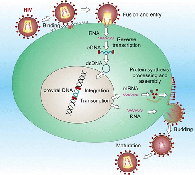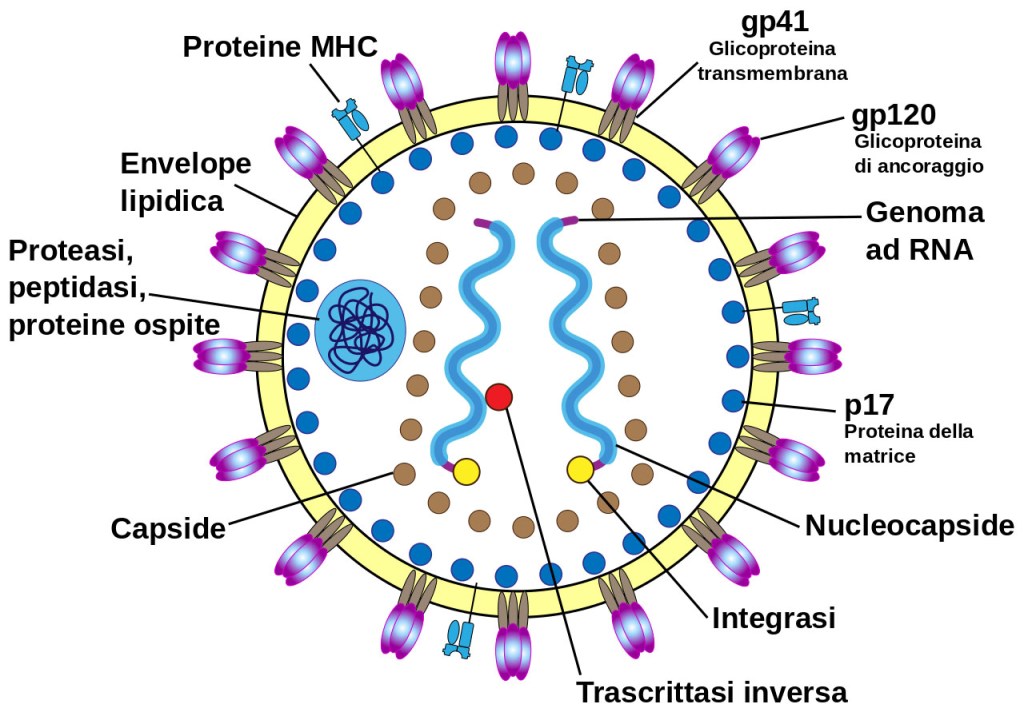 Foto d’apertura: Micrografia elettronica a scansione del virus HIV (in verde) in gemmazione da una cellula. Più protuberanze rotonde sulla superficie cellulare rappresentano siti di assemblaggio e germogliamento dei virioni.