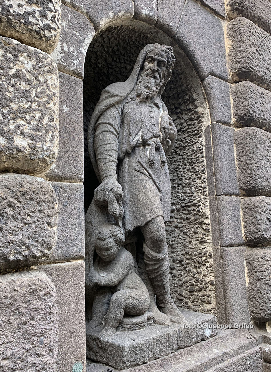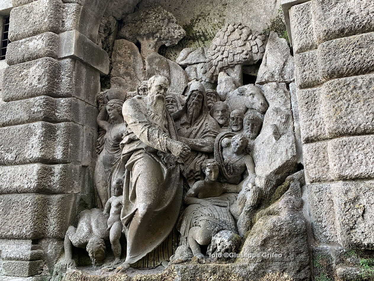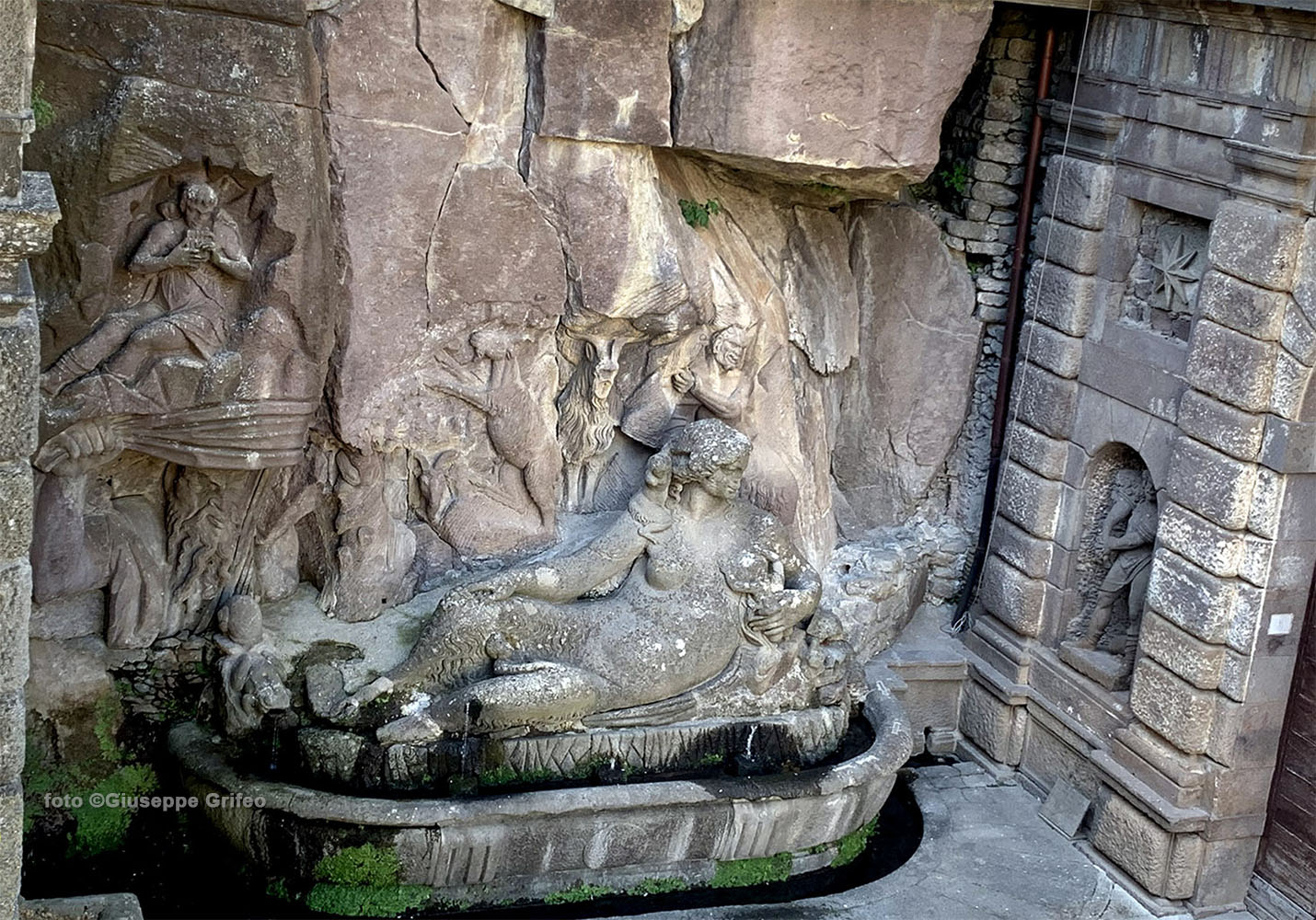 Molto particolare la Fonte di Papacqua per le figure che ornano quello che era (oggi ridotto) il grande gioco d’acqua tra la vasca principale dominata dalla figura di una donna dalle gambe di capra che ha sulle spalle un satiro affiancato da un gufo, poi animali fantastici, serpenti rane, pecore, capre, bambini, il dio Pan, le quattro stagioni, Mosè che con accanto un asino e altri ebrei fa scaturire le acque dalla roccia.