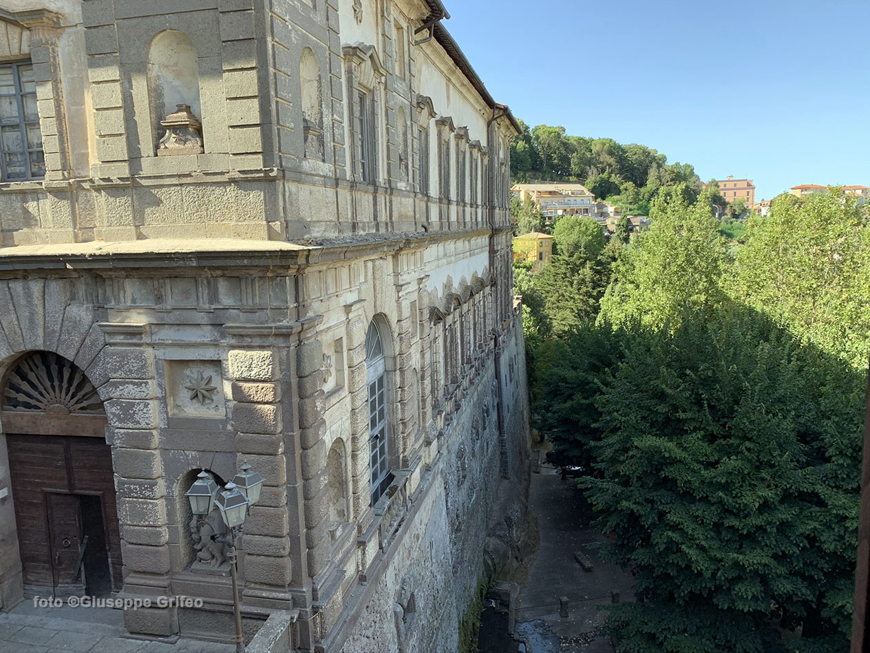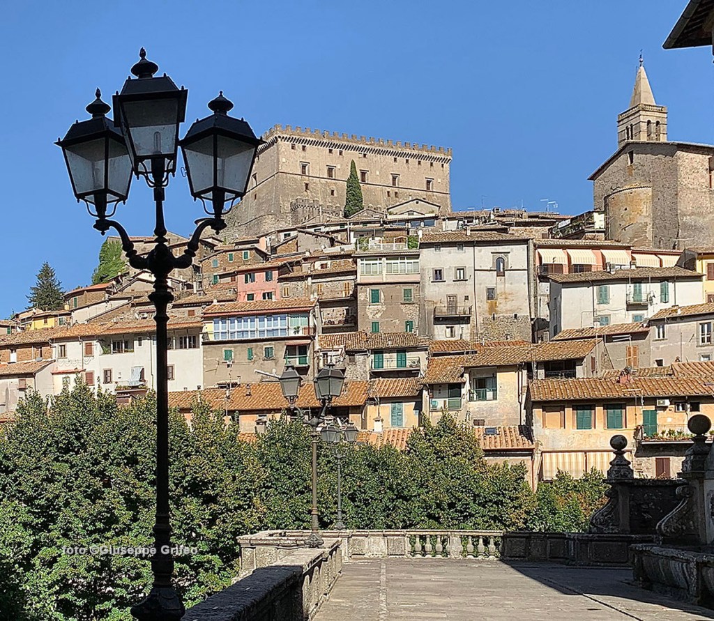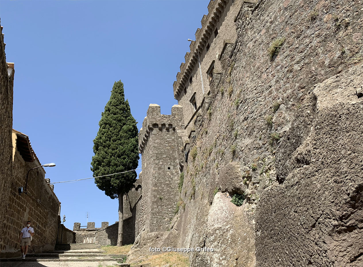Torri, mura di cinta in pietra grigia massiccia, fontane, tutto l’antico abitato a oltre 500 metri d’altezza, all’ombra del Monte Cimino. I quattro rioni, la magia dell’ambientazione medievale, stemmi, alti campanili, portali sormontati da emblemi storici, strette vie fra le case da cui risuonano voci e rumori di stoviglie all’ora del pranzo o della cena, suoni amplificati dalle pareti ravvicinate degli stessi edifici.