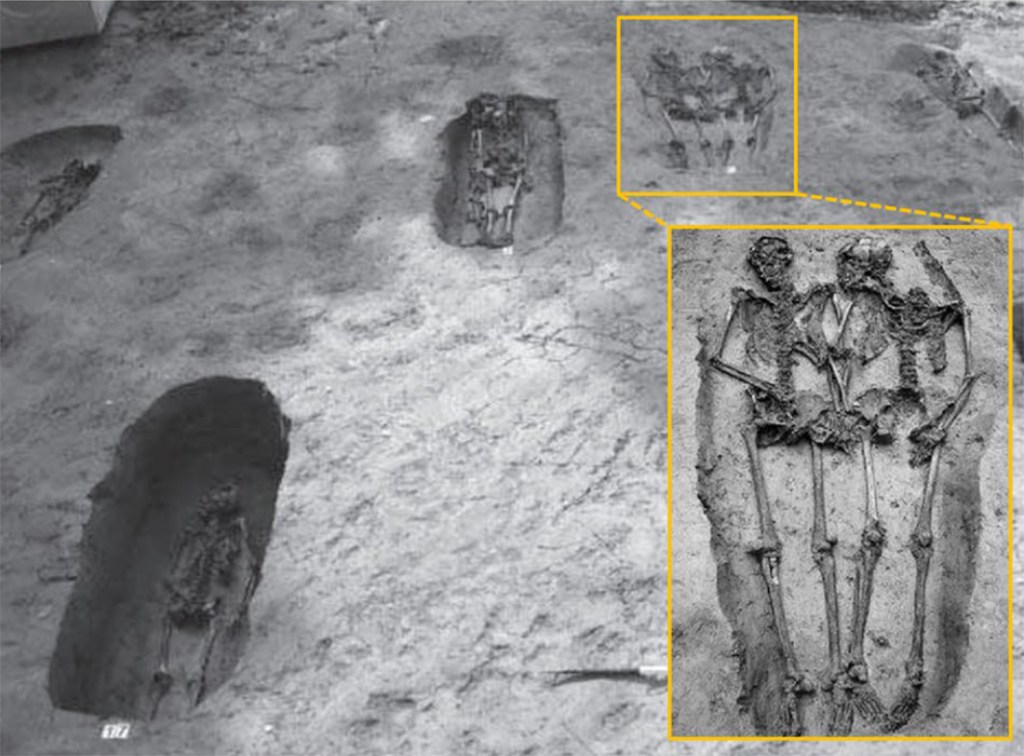 Questa sepoltura si trovava tra altre 17 che furono esaminate sul luogo e gli archeologi ne trovarono sei con i resti di uomini morti probabilmente per ferite inferte con armi da taglio.
