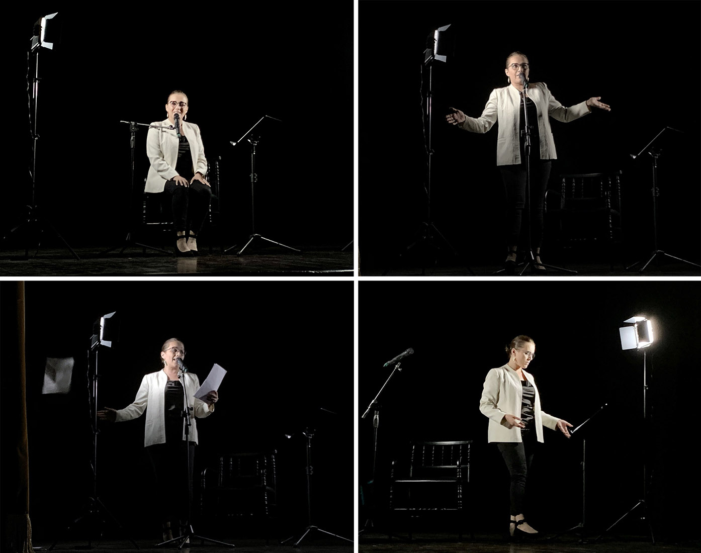 Nella rappresentazione l’attrice trascina, sposa la modernità, o meglio, la non databilità della vicenda (attualissima nel suo vissuto e nel concatenarsi) portandosi in scena con abiti a noi contemporanei. Un gioco appositamente scelto con il regista Marco Fasciana.