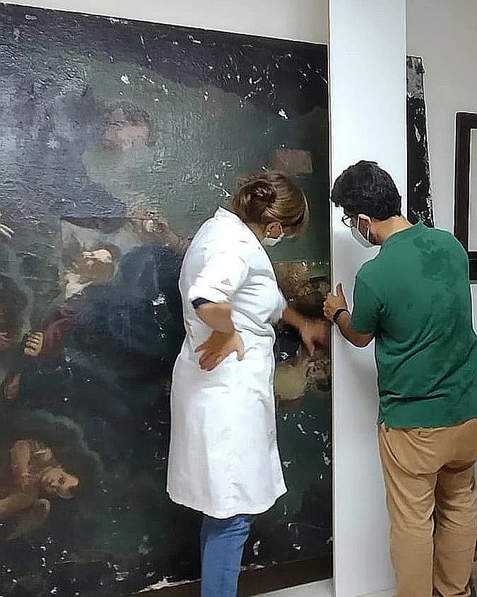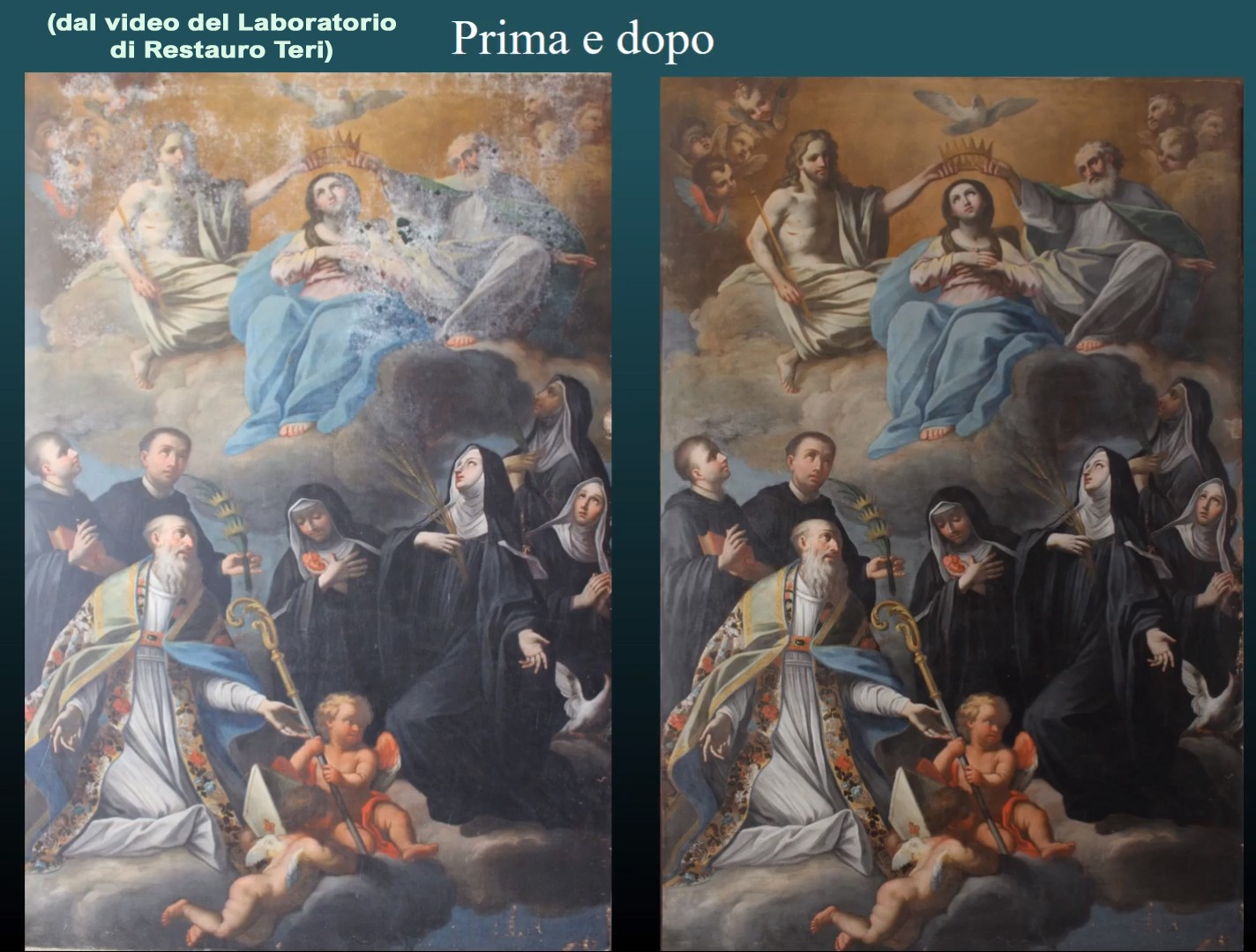 Tornando al dipinto, la sorpresa si è manifestata durante questa fase del restauro indagando durante la ripulitura/sondaggio di porzioni iniziali e dopo una diagnostica con raggi X eseguita dalla S.T.Art-Test (link) di S. Schiavone & C (Niscemi – Caltanissetta), prassi non invasiva sull’intero quadro. L’opera originaria presenta colori ben brillanti e molti dei soggetti erano stati eseguiti nel 1600 con mano artistica ben più sapiente e tecnica pittorica ben più accurata rispetto alle fattezze oggi visibili in superficie.