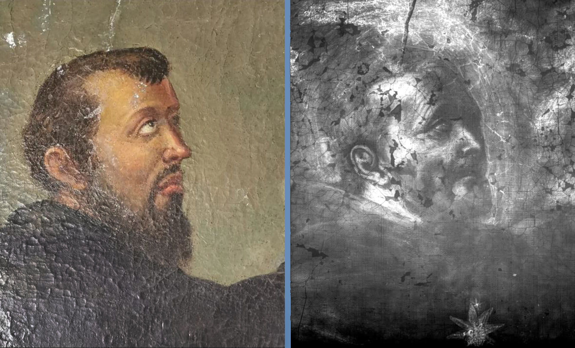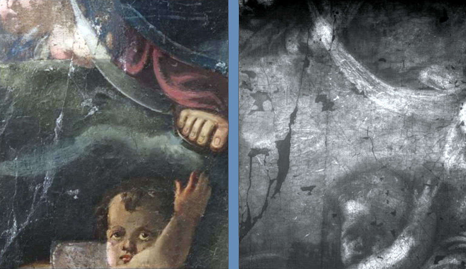 Foto con raffronto tra la pittura di superficie frutto del restauro novecentesco e le immagini da sondaggio a raggi X che svelano il vero aspetto del dipinto seicentesco
