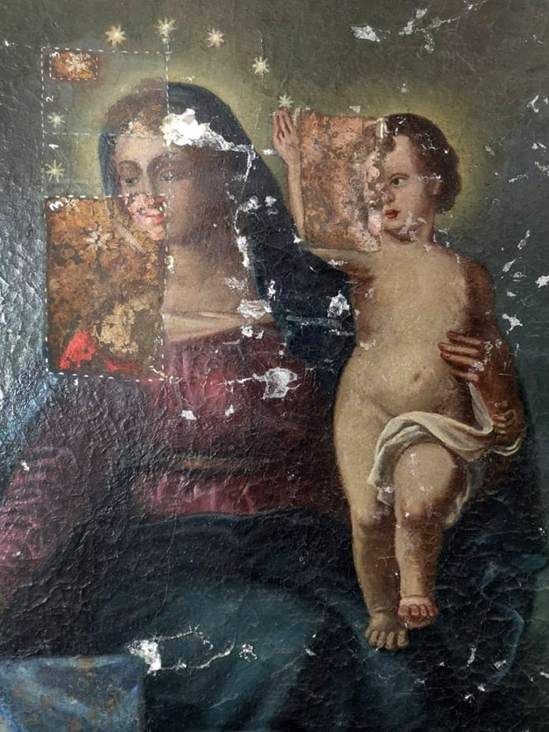Dall’indagine diagnostica ai raggi X appaiono in piena evidenza le variazioni rispetto al dipinto seicentesco originario, mutazioni che con lo pseudo restauro di inizio 1900 cambiarono profondamente la rappresentazione di molti elementi, a cominciare dalle differenti dimensioni-posizione della stessa Madonna e del Bambinello, dei panneggi (a volte interrotti o eliminati nel rifacimento più recente), delle posizioni e naturalezza degli sguardi, di molte figure, la differente rappresentazione e posizione di mani e piedi, quando non fecero letteralmente sparire alcune figure tra putti, cherubini e altro. Per non parlare, appunto, del bellissimo ritratto del Santo, figura occultata da un’immagine elementare e scadente sovrapposta dal restauro elementare/invasivo di inizio XX secolo.