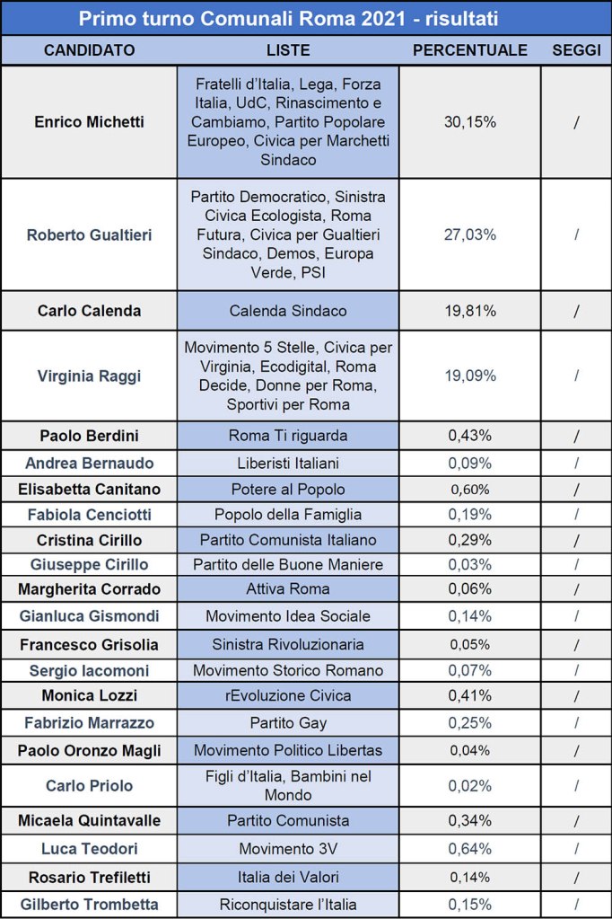 Il centrodestra con Enrico Michetti, in vantaggio al primo turno, affronta il candidato del centrosinistra, l’ex ministro Roberto Gualtieri (i risultati del primo turno su tutti i candidati romani si trovano a fine articolo).