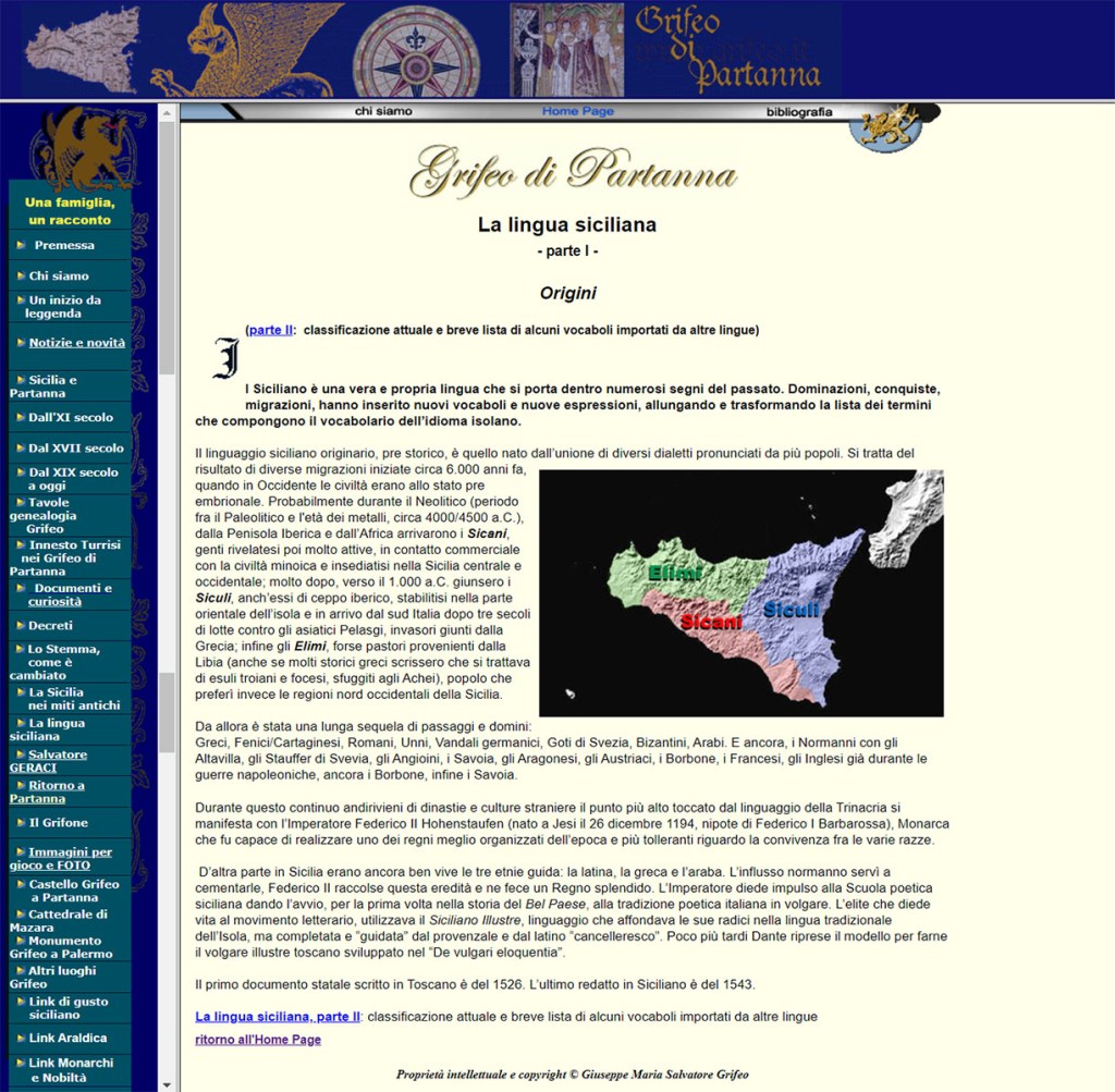 Per raccontare il sito web grifeo. it scrissi questo testo riferendomi sia alla mia famiglia che alla Sicilia: […] Serviva quindi uno spazio che rappresentasse un forte tributo a tanto attaccamento alla vita e a tali grandi capacità di sopravvivenza secolare. Uno spazio che fungesse anche da archivio, pur se virtuale, ma disponibile in Rete, visitabile da chiunque in Italia e nel mondo. Un pezzo di storia da visitare, analizzare, rivivere. Una sorta di raccolta-racconto che fosse gustoso, destasse curiosità, ma che non riguardasse solo la Famiglia: volevo fosse anche un inno alla sicilianità fissandone molti aspetti. Da qui la prima idea, complessa ma divertente, che ha portato alla preparazione di questo sito web.