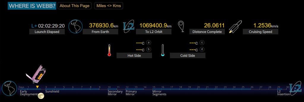 Per un monitoraggio continuo messo a disposizione dei lettori dalla Nasa, sulla distanza dalla terra, situazione del telescopio JWST, l’orbita, la velocità, lo stato di dispiegamento della struttura e dello specchio, basta cliccare sull’immagine qui in basso.