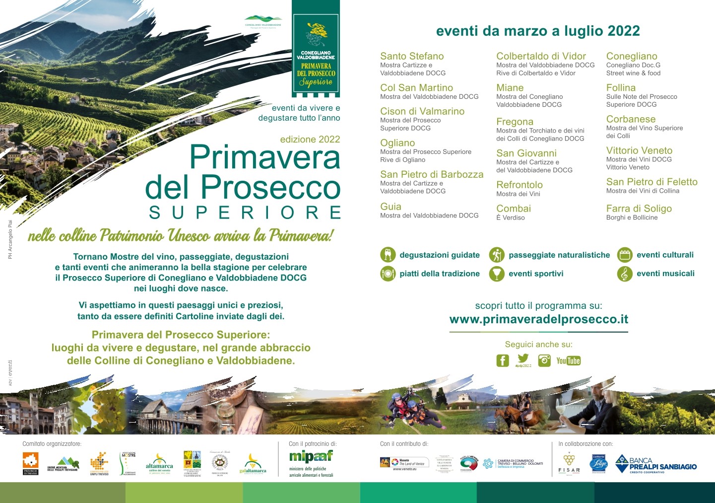 La Primavera del Prosecco Superiore vede l’inaugurazione ufficiale il 27 marzo 2022. L’evento multiluogo-multiforme è unico per la sua capacità di far vivere al turista un’esperienza indimenticabile guidata dalla grande tradizione enologica del Conegliano Valdobbiadene DOCG che diventa un vero e proprio “filo d’Arianna”. In questo modo il visitatore potrà esplorare e vivere il territorio, la cultura e l’ospitalità locale, immergendosi nello spirito che anima le 17 Mostre di Primavera e lo farà grazie a spettacoli, visite guidate, passeggiate naturalistiche, eventi sportivi e tante altre manifestazioni.