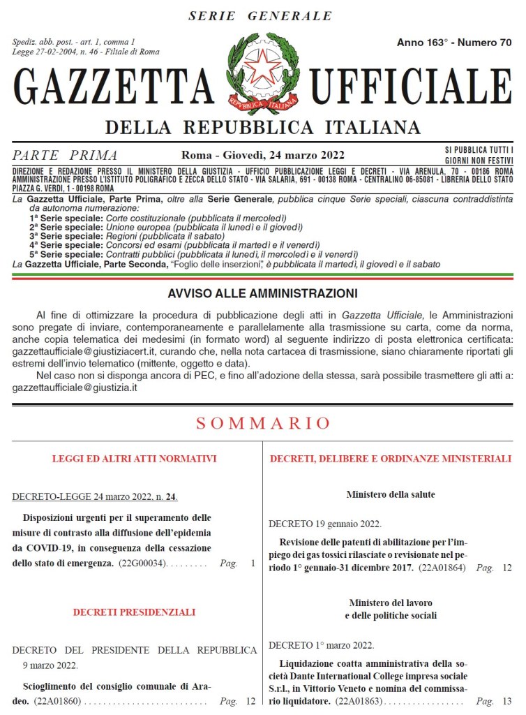 Tornando alla realtà, il Decreto Legge 24 marzo 2022, n. 24 (link lettura) ha messo nero su bianco tutto quanto. Il sottotitolo del dispositivo è eloquente: “Disposizioni urgenti per il superamento delle misure di contrasto alla diffusione dell’epidemia da COVID-19, in conseguenza della cessazione dello stato di emergenza. (22G00034) (GU Serie Generale n.70 del 24-03-2022)“.