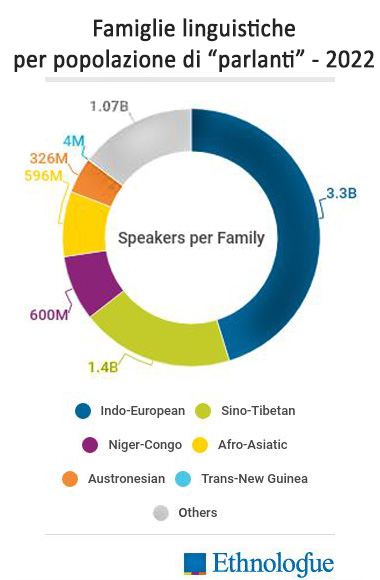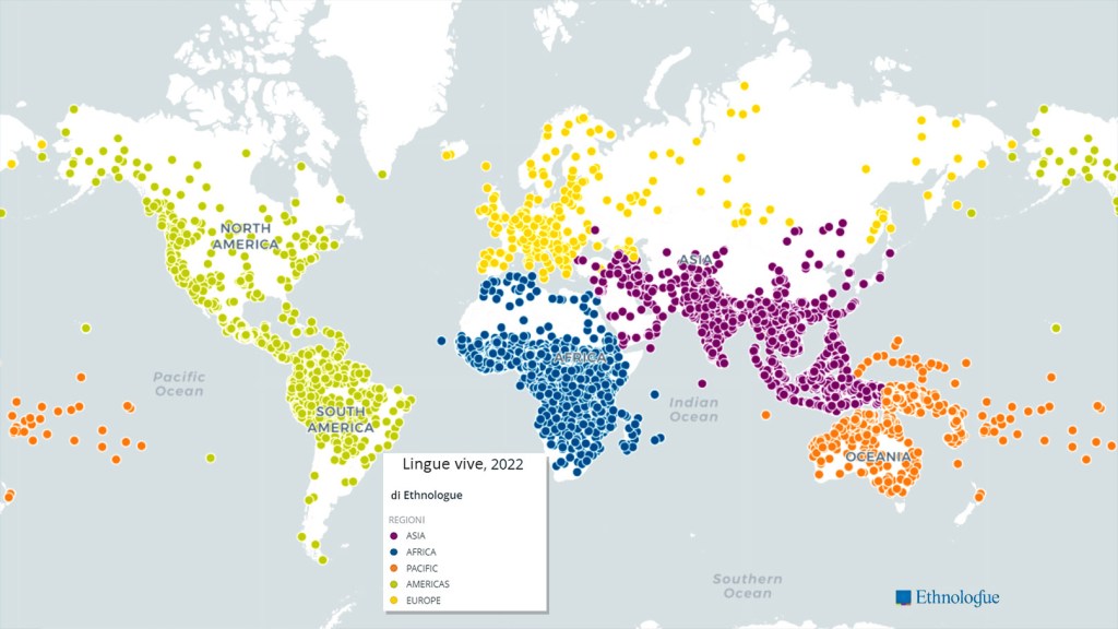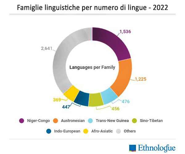 Un primo dato? Fino a questo momento del 2022 nel Mondo si parlano 7.151 lingue, un’enormità. Un numero che è in continua mutazione come molti altri di questo monitoraggio perché i linguaggi sono dinamici e prendono vita o muoiono dai cambiamenti delle società umane. Estrapolando i particolari dal totale, spuntano fuori dati più specifici.