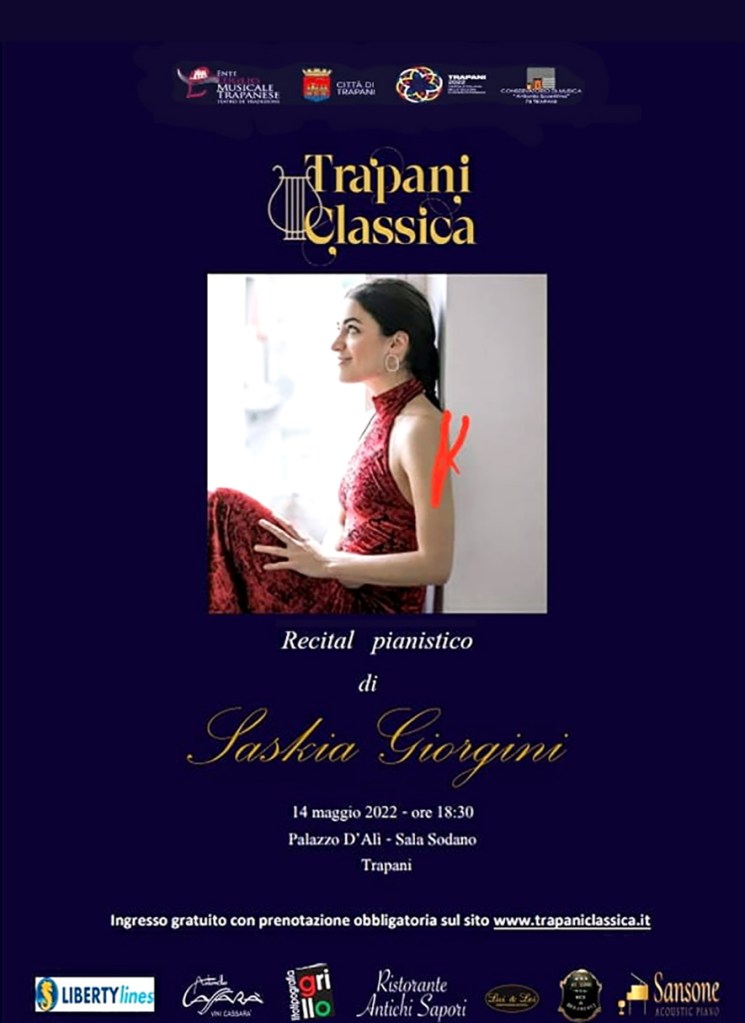 “Ero troppo piccola per ricordarmi visto che ho iniziato a imparare e a suonare quando avevo 3 anni e mezzo, ma la musica mi ha accompagnato sin dall’inizio della mia vita, è una cosa che ho sempre fatto, non mi sono mai posta domande sul perché: per me è una cosa naturale suonare, essere al pianoforte. È come respirare e fare qualsiasi gesto. Non mi vedrei in nessun altro modo”. Così si descrive Saskia Giorgini (link sito web), giovane pianista nata nella Musica, in concerto il 14 maggio a Palazzo d’Alì, ore 18,30 Sala Sodano. Il tutto organizzato dall’’Associazione musicale e culturale “Trapani Classica”, presieduta dal Maestro Vincenzo Marrone d’Alberti, evento allestito con il concorso dell’Ente Luglio Trapanese – Trapani Capitale della Cultura, Assessorato alla Cultura della Città di Trapani.