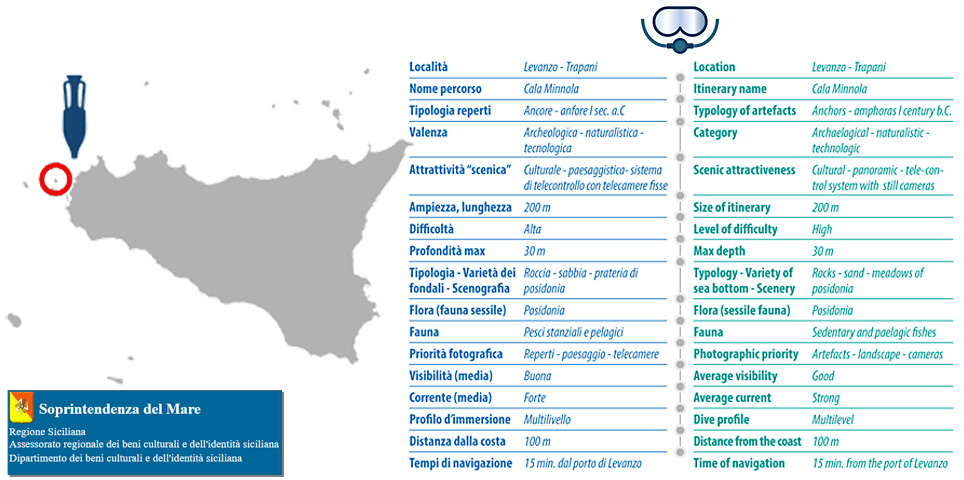 The submerged archaeological site is located on the east coast of Levanzo island in the Egadi archipelago. On the seabed there are the remains of a cargo ship from the Roman era, lying less than 30 meters deep.