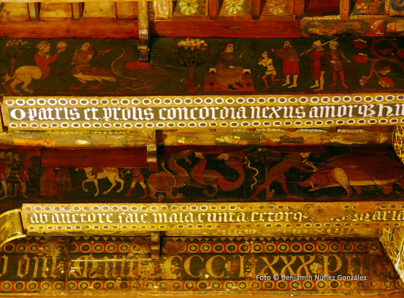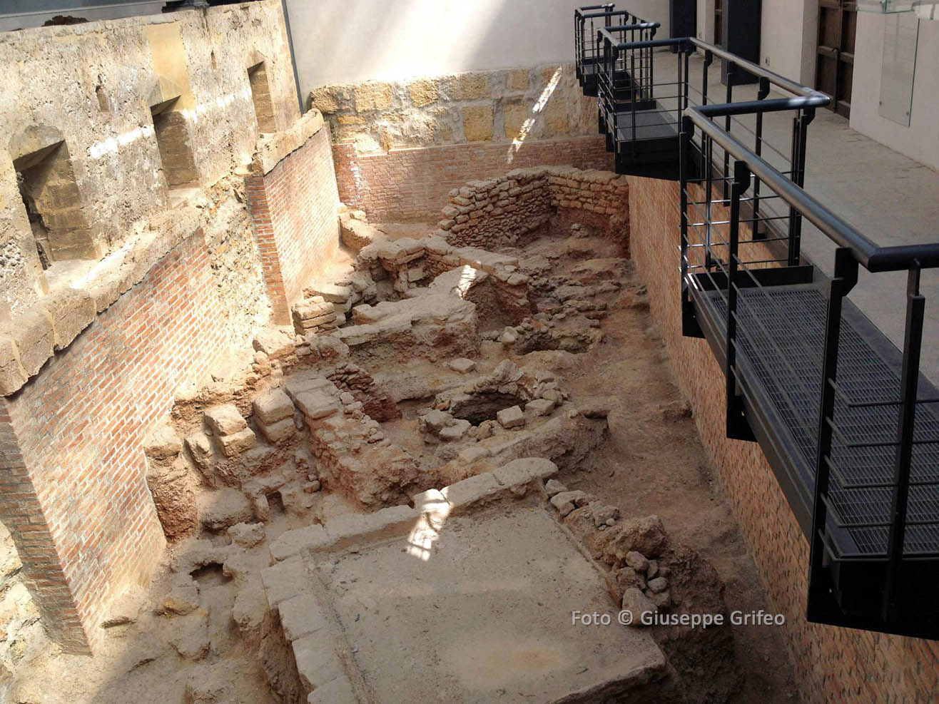 Qui sopra alcune immagini dell’interno. Le prime tre foto ritraggono una piccola porzione della volta della Sala Magna con decorazioni su imprese cavalleresche-fantastiche e gli ancoraggi delle travi dove compaiono gli stemmi di storiche famiglie siciliane: nella prima foto si vede al centro lo stemma Moncada, A seguire la Corte, la grande campana, una delle aperture a trifora con tipiche modanature. Infine, uno scorcio del palazzo e del circuito di visita ai preesistenti siti musulmani di produzione delle ceramiche e del vetro