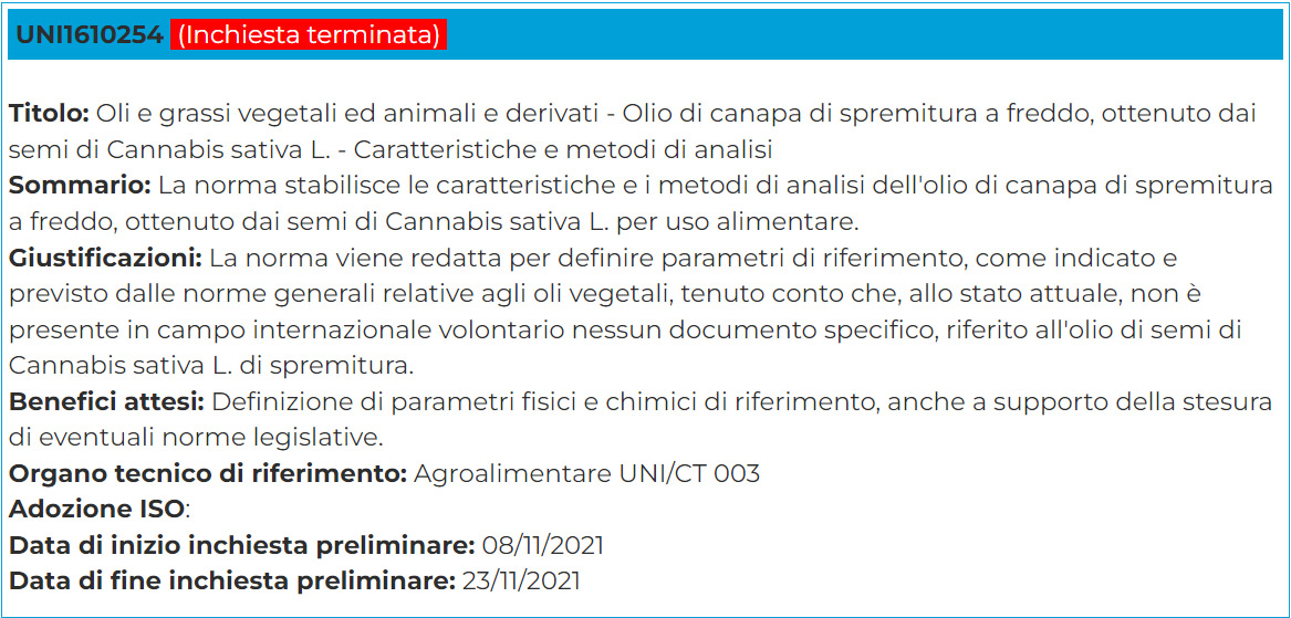 Presentazione della norma commerciale UNI 1610254 per l’olio di semi di canapa spremuto a freddo, proveniente dalle piante iscritte al catalogo delle varietà delle specie di piante agricole