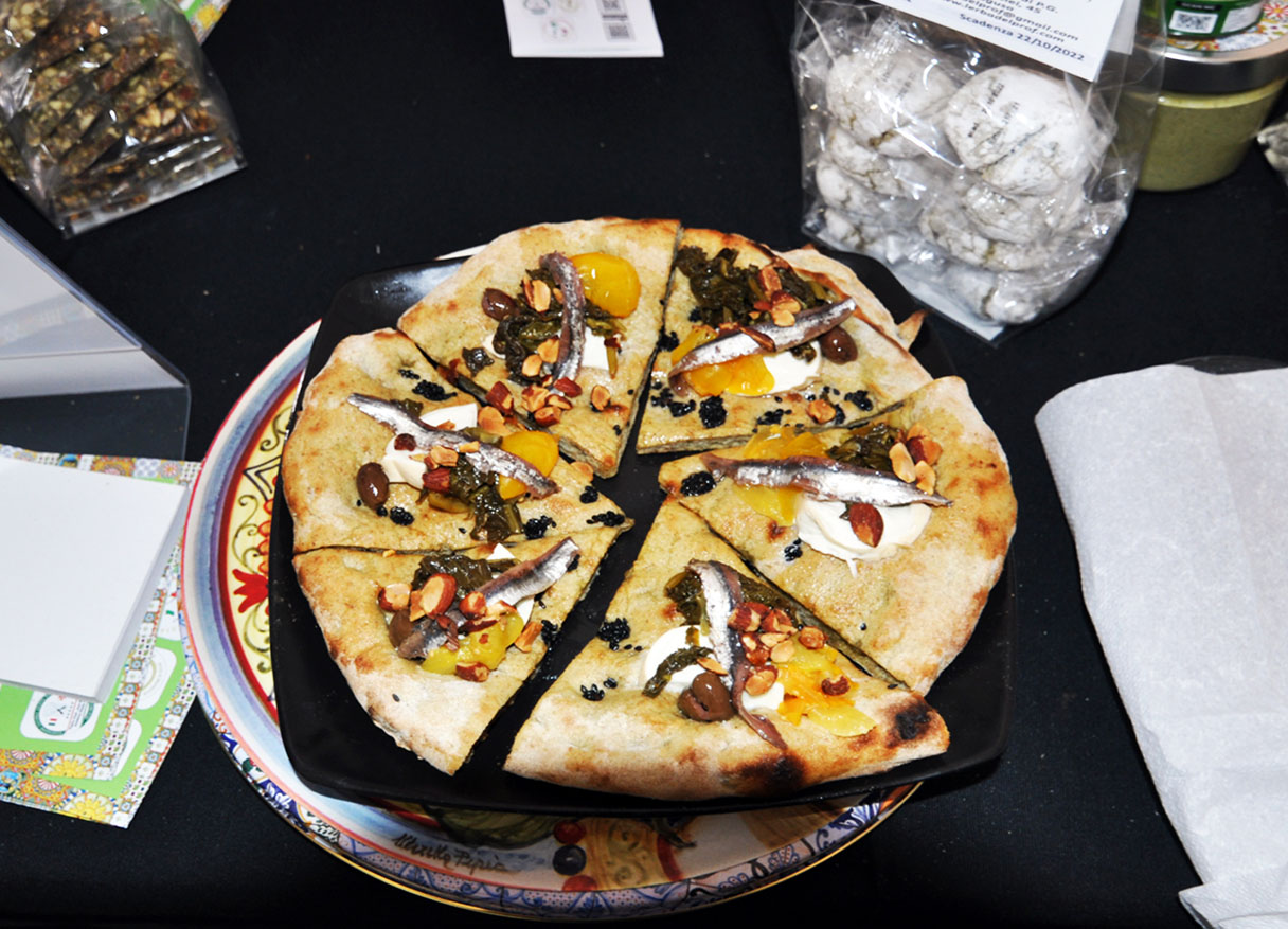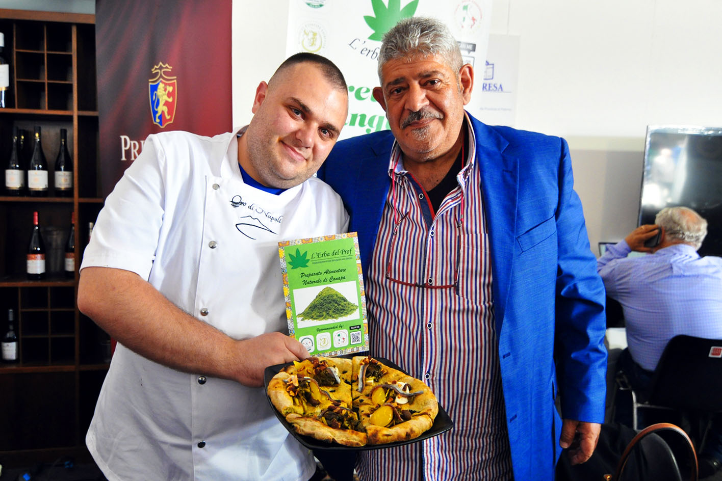 Nelle foto qui in alto, alcuni dei prodotti de L’Erba del Prof, il pizzaiolo Giuseppe Bologna con Giovanni Puglisi e la pizza alle acciughe modellata con impasto a base di farina di canapa