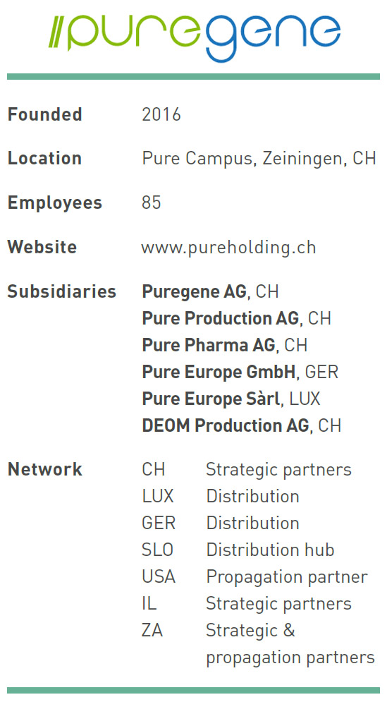 Una missione cui si sono dedicati da anni, Stevens Senn per primo, presidente e amministratore delegato di Puregene AG e di Pure Holding AG. Fondamentale fu il suo incontro con il professore Bruno Studer, responsabile del Molecular Plant Breeding dell’ETH-Politecnico Federale di Zurigo: ha originariamente ideato e ispirato l’idea che ha aperto la strada a Puregene. Nel 2016 Stevens Senn registrò i primi fiori di CBD come sostituti del tabacco al BAG/OFSP/UFSP o Ufficio federale della sanità pubblica e fondò anche la Pure Production AG.